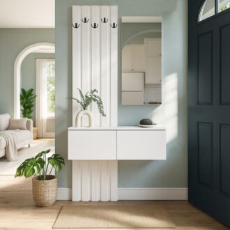 προσφέροντας πρακτικότητα και αισθητική ισορροπία. Οι κάθετες λεπτομέρειες χαρίζουν μια μοντέρνα πινελιά, ενώ ο ενσωματωμένος καθρέπτης φωτίζει