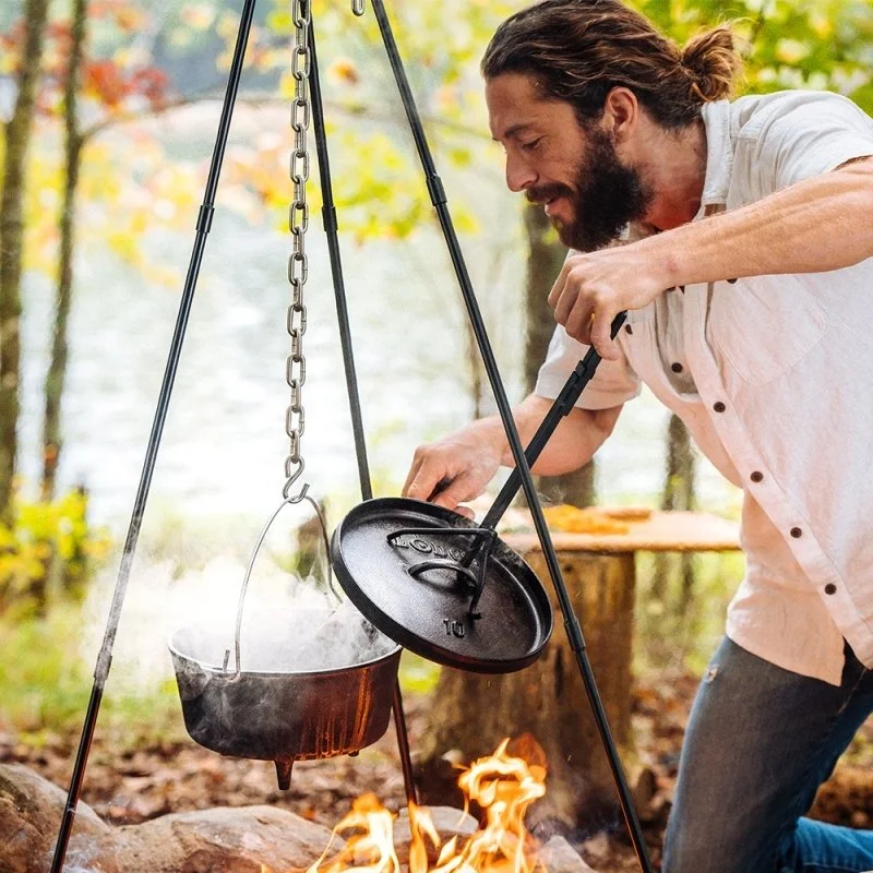 Στη συνέχεια, την κρεμάς εύκολα σε τρίποδο, ενώ αξιοποιείς την ανθεκτική ανοξείδωτη χειρολαβή για slow cooking στην ύπαιθρο.