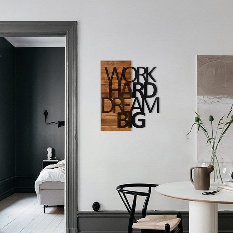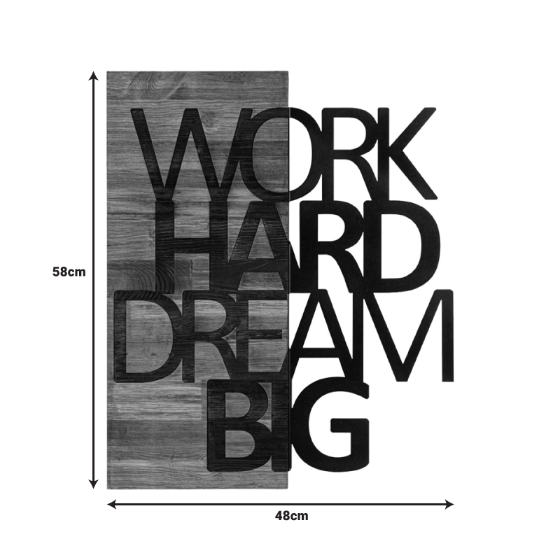 Ανεβάστε την ενέργεια και τη θετικότητα του χώρου σας με αυτό το μοναδικό ξύλινο διακοσμητικό τοίχου! Οι λέξεις “WORK HARD DREAM BIG” αποτυπωμένες με στυλ σε φυσικό ξύλο, αποτελούν μια καθημερινή υπενθύμιση για να κυνηγάτε τους στόχους σας με πάθος και αφοσίωση. Ιδανικό για το σπίτι, το γραφείο ή οποιονδήποτε χώρο θέλετε να εμπνεύσετε. Προσθέστε μια πινελιά ζεστασιάς και motivation στον τοίχο σας! Κάντε το δικό σας και δώστε ώθηση στα όνειρά σας!
