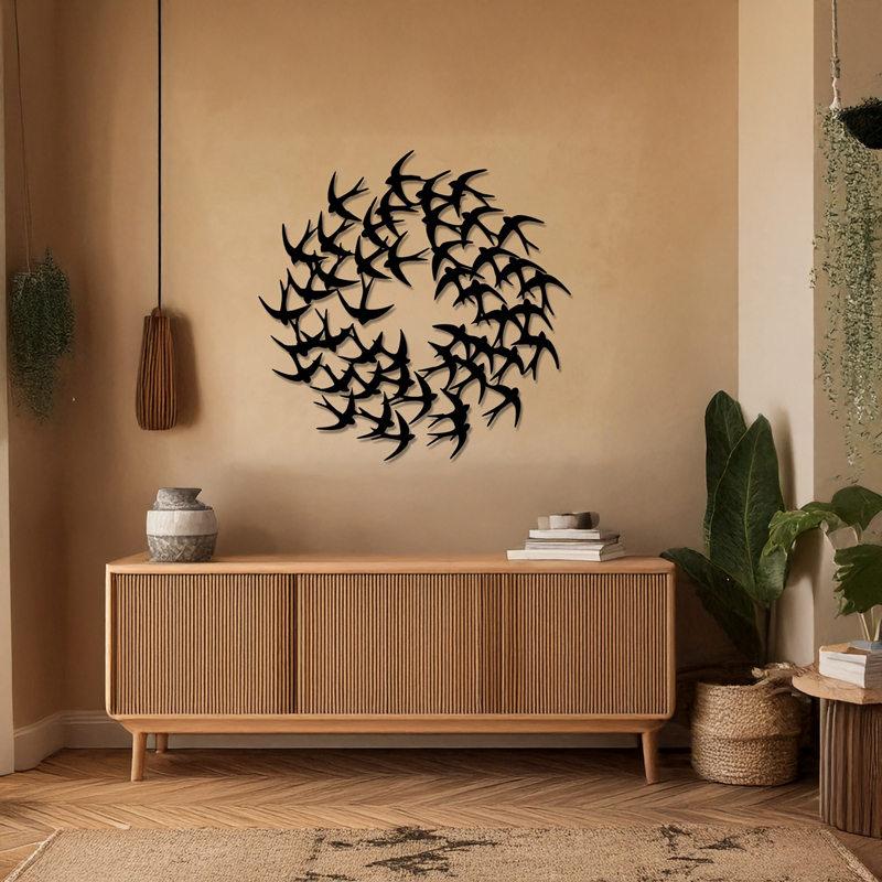 Φέρτε την κίνηση και τη ζωντάνια της φύσης μέσα στο σπίτι σας με το Swarm, ένα εντυπωσιακό διακοσμητικό που απεικονίζει ένα σμήνος χελιδονιών σε κυκλικό σχηματισμό. Αυτό το έργο τέχνης δεν είναι απλώς μια διακόσμηση, αλλά μια έκρηξη κίνησης που μεταμορφώνει κάθε άψυχο τοίχο σε ένα ζωντανό σκηνικό.