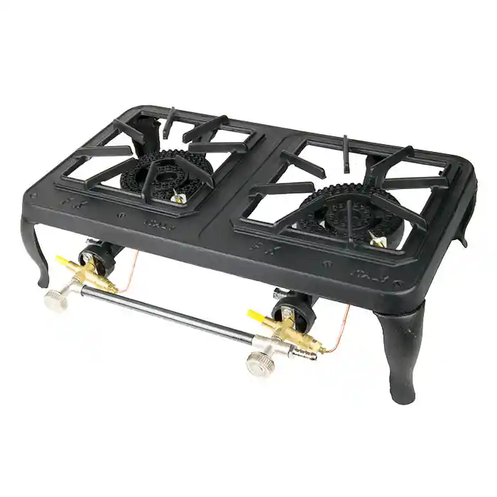 Ανακαλύψτε την διπλή μαντεμένια εστία υγραερίου χαμηλής πίεσης, σχεδιασμένη με βάση και καυστήρες από μαντέμι αλλά και θερμικά ασφαλείας.