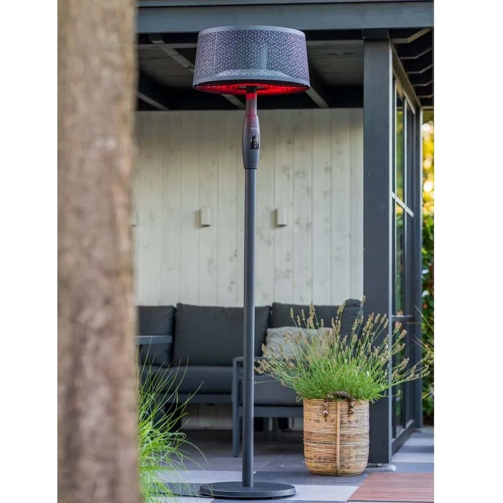 Με αυτήν την όμορφη μοντέρνα θερμάστρα βεράντας με αμπαζούρ σχεδίασης κοπής λέιζερ, σίγουρα θα τραβήξετε μεγάλη προσοχή στο πάρτι στον κήπο σας.