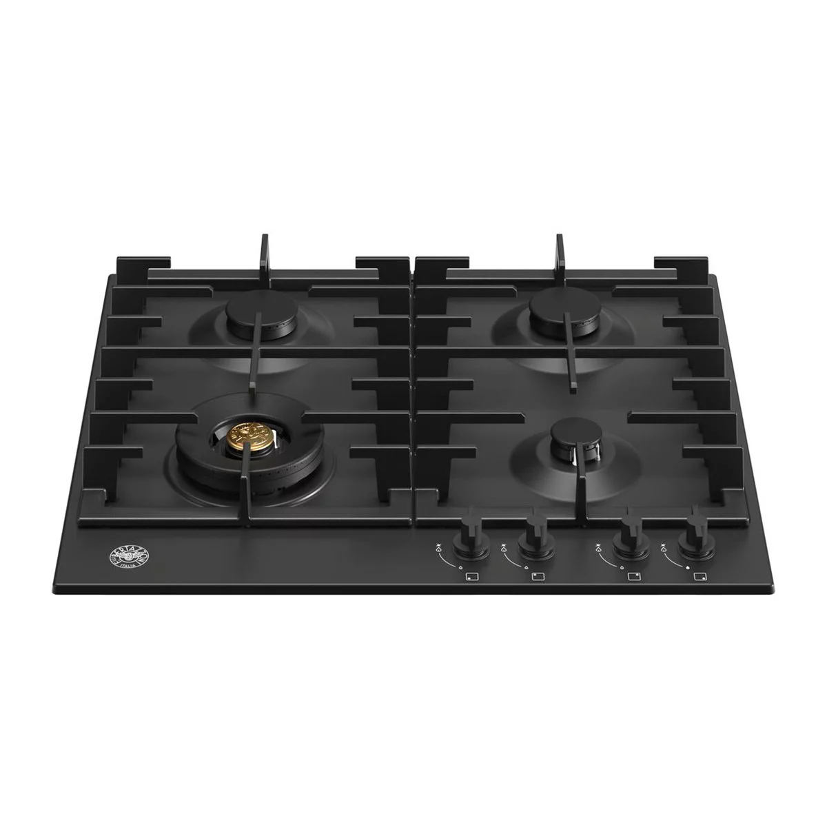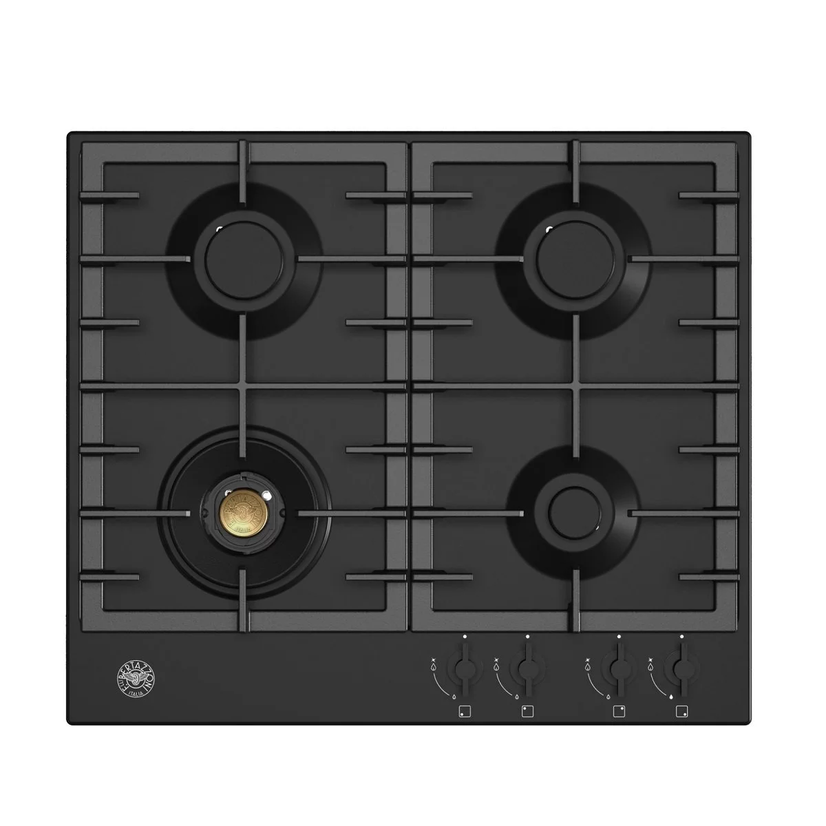 Εστία αερίου Bertazzoni P60 4L MOD NE με 4 καυστήρες, μαύρη ματ επισμαλτωμένη επιφάνεια, 1 καυστήρας διπλής φλόγας WOK 4kW, 3 καυστήρες με διασπορείς αλουμινίου και καπάκια ενσωματωμένα (mono-block), σχάρες χυτοσιδήρου, μαύροι επιλογείς SoftTouch.
