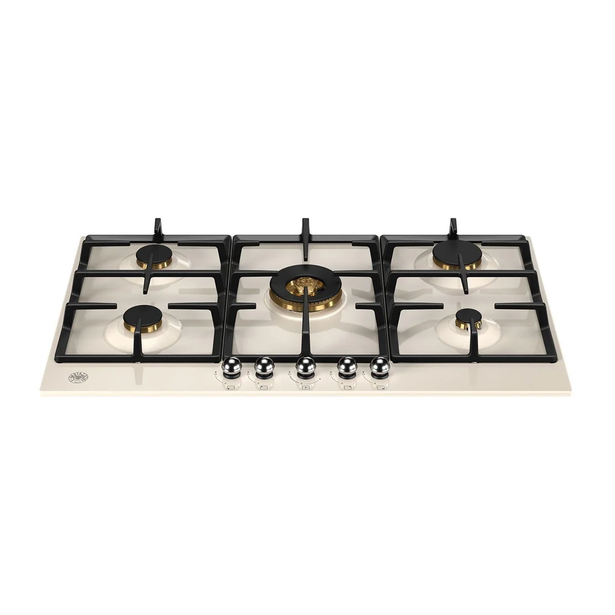 Εστία αερίου Bertazzoni P90 5C HER AX με 5 καυστήρες, μπεζ επισμαλτωμένη επιφάνεια, 5 καυστήρες με ΜΠΡΟΥΤΖΙΝΟΥΣ διασπορείς, σχάρες χυτοσιδήρου, WOK καυστήρας διπλής φλόγας & διπλής ζώνης  5kW μασίφ μεταλλικοί επιλογείς