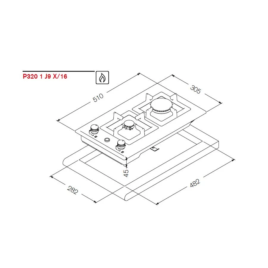 Εστία, 1 καυστήρα αερίου WOK, 1 καυστήρας διπλής φλόγας, με αλουμινένιους διασπορείς, σχάρα χυτοσιδήρου, χειρισμός με περιστρεφόμενο επιλογέα, επιλογέας μεταλλικός