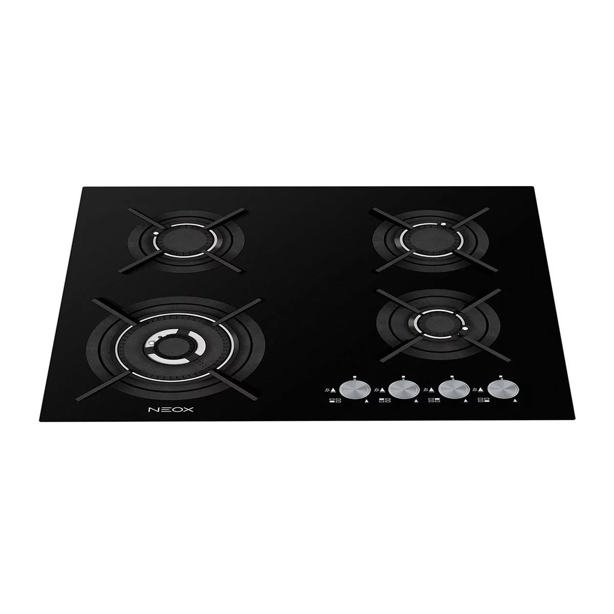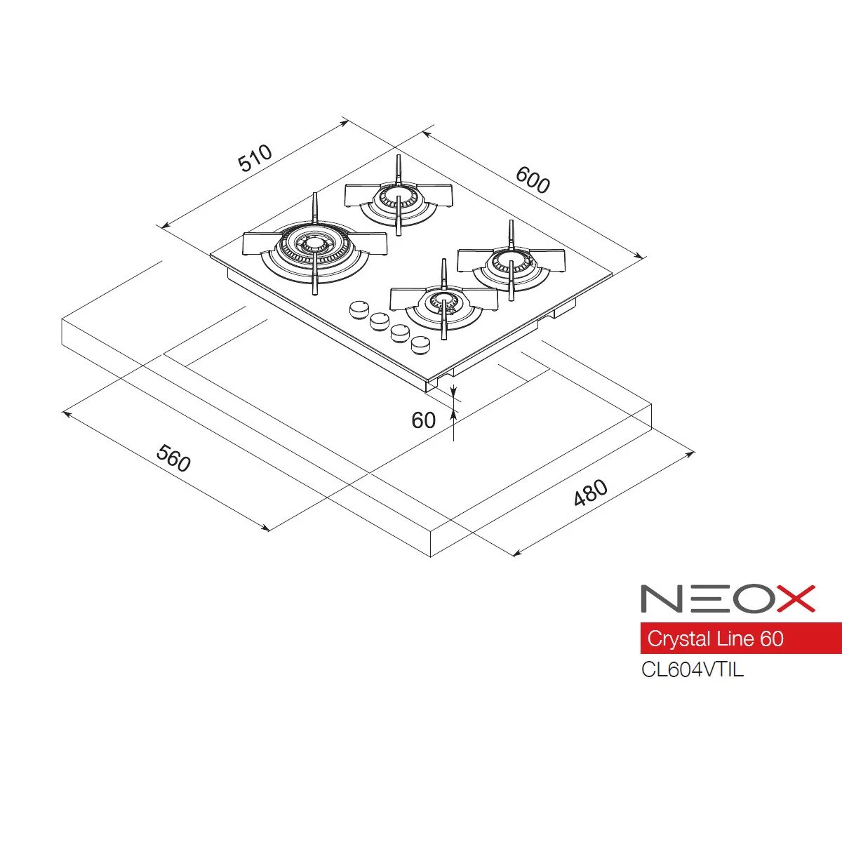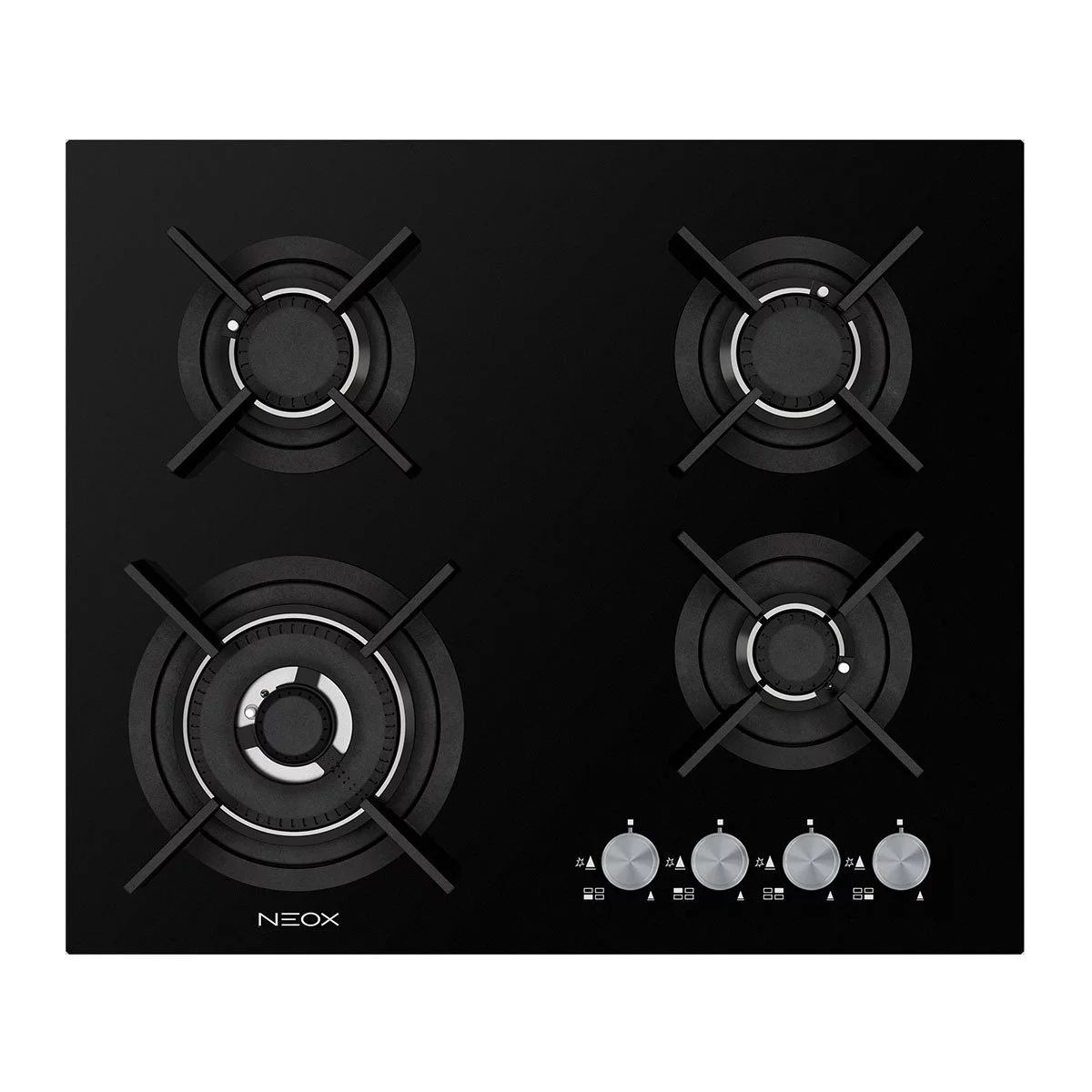 Εστία αερίου Neox CL604VTIL 60εκ. με 4 καυστήρες με διασπορείς αλουμινίου, κρυστάλλινη πυράντοχη μαύρη επιφάνεια, 5ης γενιάς με επίπεδο σχεδιασμό και υψηλή απόδοση, καυστήρας διπλής φλόγας WOK 4kW, σχάρες χυτοσιδήρου, επιλογείς ασημένιοι (ή μαύροι με πρόσθετη χρέωση)