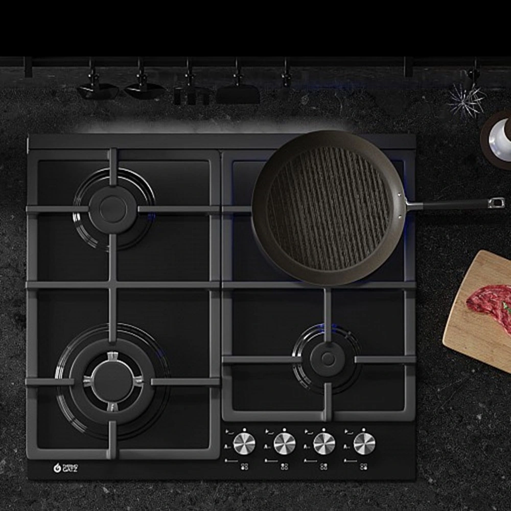 Η κομψή επιφάνεια από μαύρο γυαλί δίνει μοντέρνα αισθητική στην κουζίνα σου, ενώ οι μαντεμένιες σχάρες και οι διασπορείς εμαγιέ ματ προσφέρουν σταθερότητα, ανθεκτικότητα και εύκολο καθαρισμό.