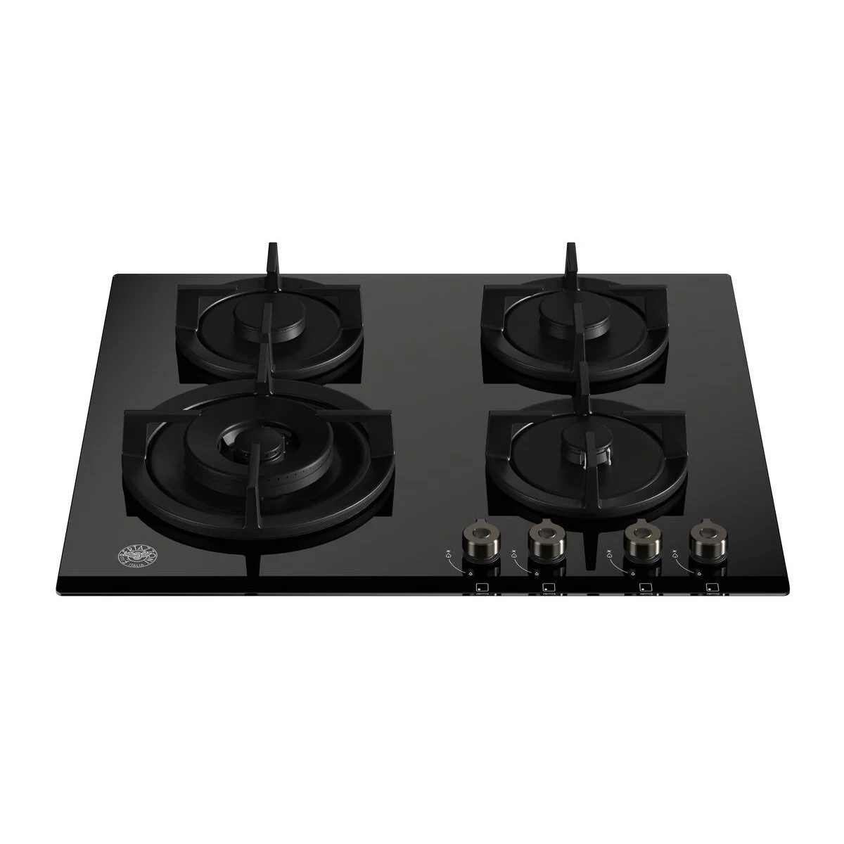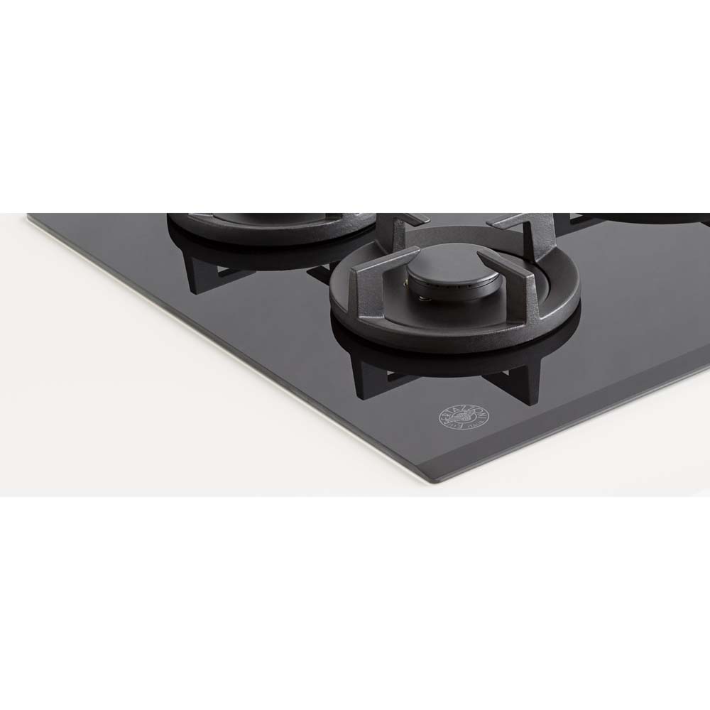 Εστία αερίου με 4 καυστήρες, μαύρη κρυστάλλινη επιφάνεια, 1 καυστήρας διπλής φλόγας WOK 4kW, 3 καυστήρες με διασπορείς αλουμινίου και καπάκια ενσωματωμένα (mono-block), σχάρες χυτοσιδήρου, μασίφ μεταλλικοί επιλογείς.