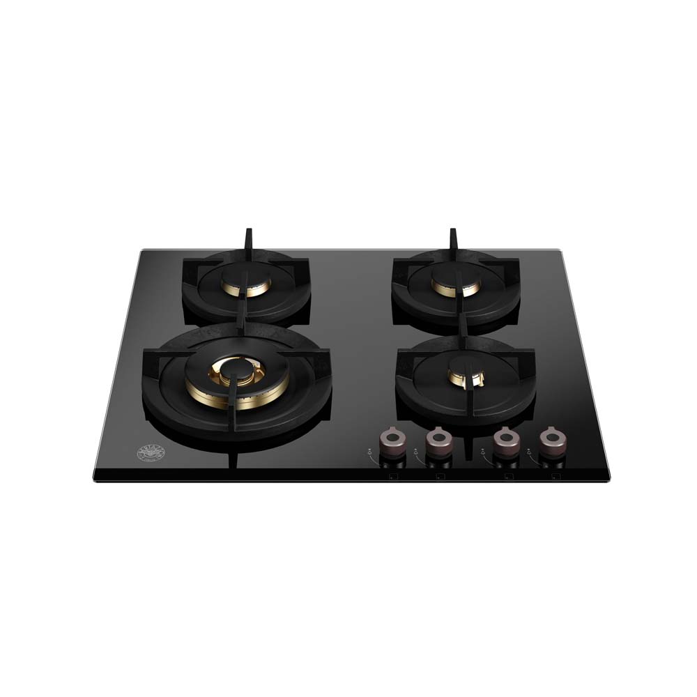Εστία αερίου με 4 καυστήρες από μπρούτζινους διασπορείς, μαύρη κρυστάλλινη επιφάνεια, 1 καυστήρας διπλής φλόγας WOK 4kW, σχάρες χυτοσιδήρου, μασίφ μεταλλικοί επιλογείς.