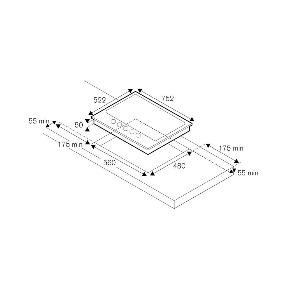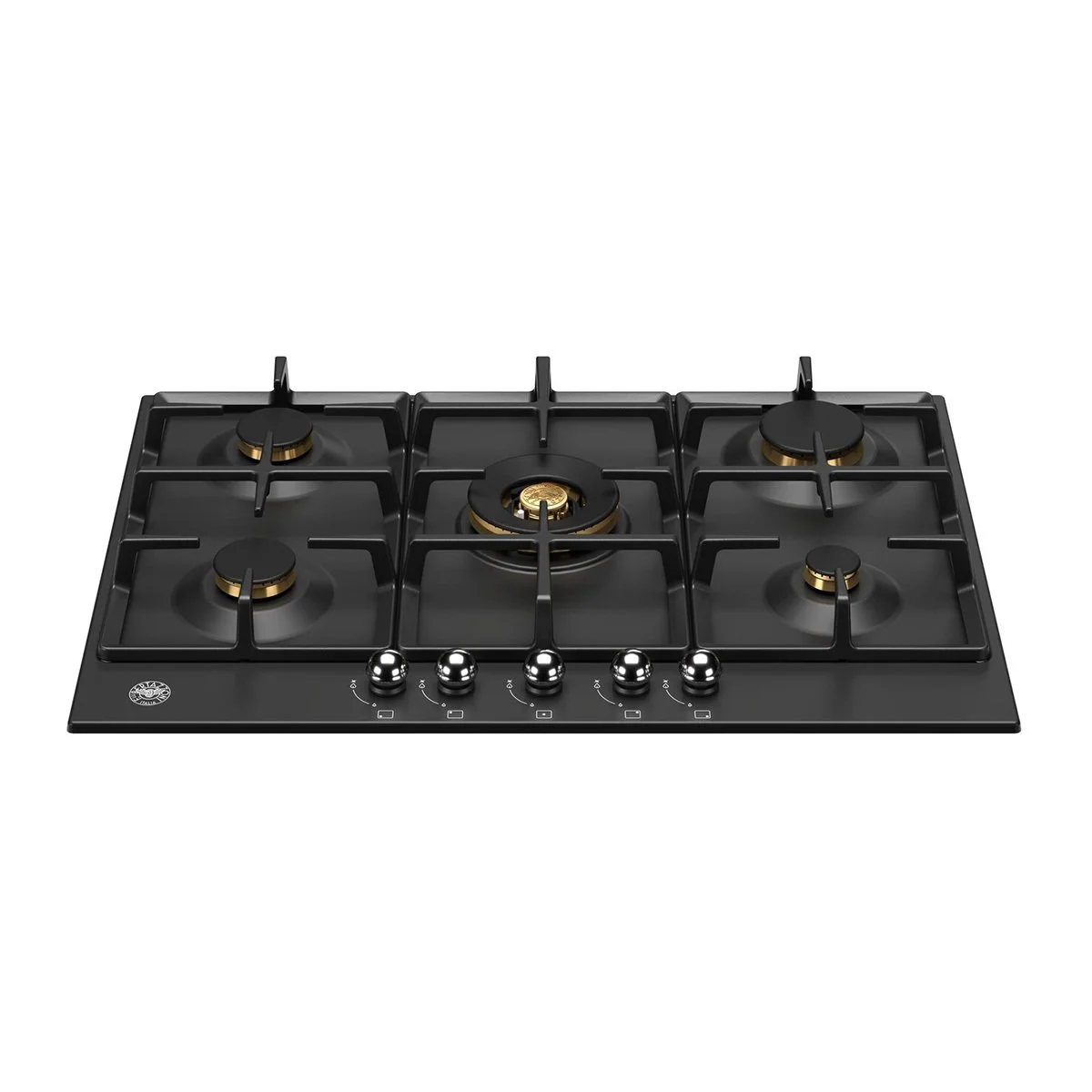 Εστία αερίου με 5 καυστήρες, μαύρη ματ επισμαλτωμένη επιφάνεια, 5 καυστήρες με ΜΠΡΟΥΤΖΙΝΟΥΣ διασπορείς, σχάρες χυτοσιδήρου, WOK καυστήρας διπλής φλόγας 4kW, μασίφ μεταλλικοί ασημένιοι επιλογείς.