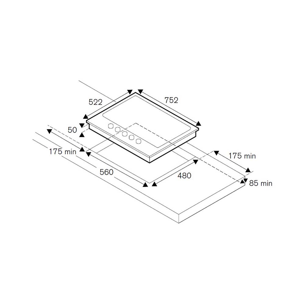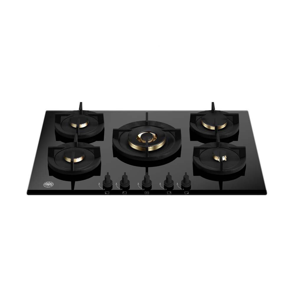 Εστία αερίου με 5 μαύρους διασπορείς αλουμινίου, μαύρη κρυστάλλινη επιφάνεια, 1 WOK καυστήρας διπλής φλόγας 4kW, σχάρες χυτοσιδήρου, επιλογείς μαύροι SoftTouch.