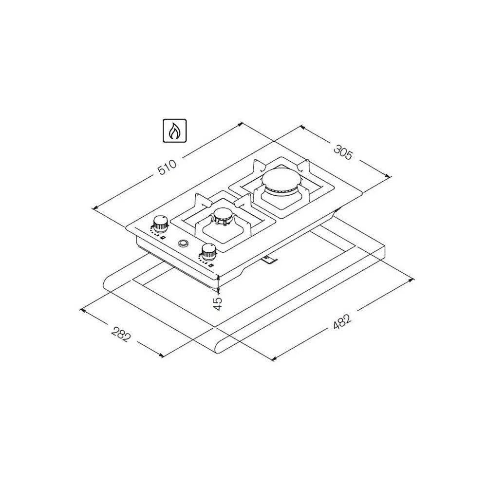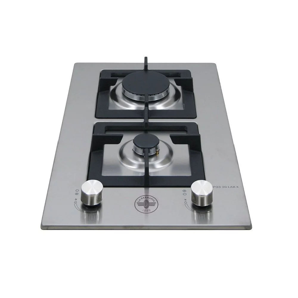 Εστία 2 καυστήρων αερίου, ανοξείδωτη, με αλουμινένιους διασπορείς, σχάρες χυτοσιδήρου, χειρισμός με περιστρεφόμενους επιλογείς.