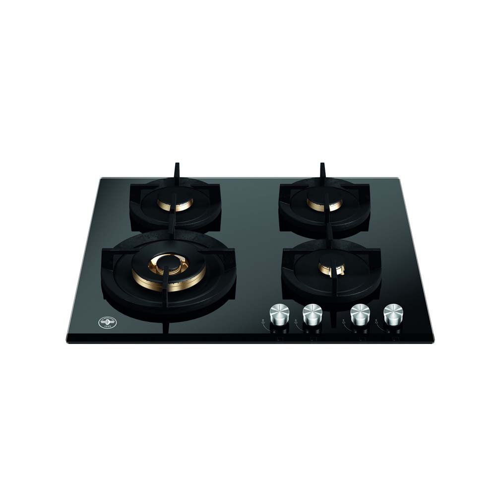 Εστία αερίου με 4 καυστήρες με μπρούτζινους διασπορείς, μαύρη κρυστάλλινη επιφάνεια, 1 καυστήρας διπλής φλόγας WOK 4kW, σχάρες χυτοσιδήρου, επιλογείς με μεταλλικό φινίρισμα.