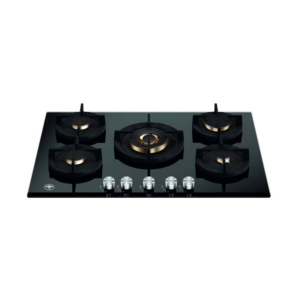 76εκ. – εστία αερίου με 5 καυστήρες, μαύρη κρυστάλλινη επιφάνεια, 1 WOK καυστήρας διπλής φλόγας 4kW, ΜΠΡΟΥΤΖΙΝΟΙ διασπορείς, σχάρες χυτοσιδήρου, επιλογείς με μεταλλικό φινίρισμα