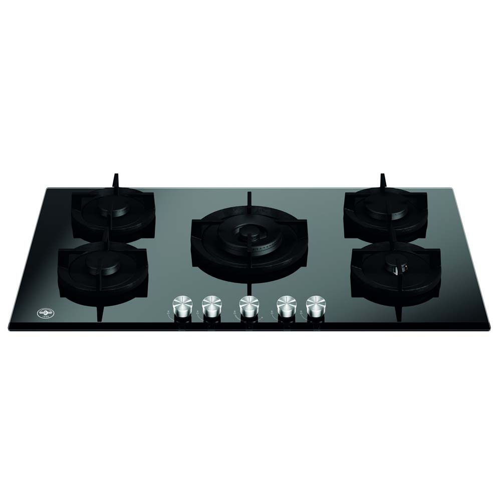 Εστία αερίου με 5 καυστήρες με διασπορείς αλουμινίου και καπάκια ενσωματωμένα, μαύρη κρυστάλλινη επιφάνεια, 1 WOK καυστήρας διπλής φλόγας, & διπλής ζώνης 5kW, σχάρες χυτοσιδήρου, επιλογείς με μεταλλικό φινίρισμα