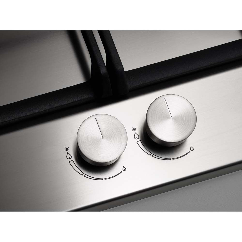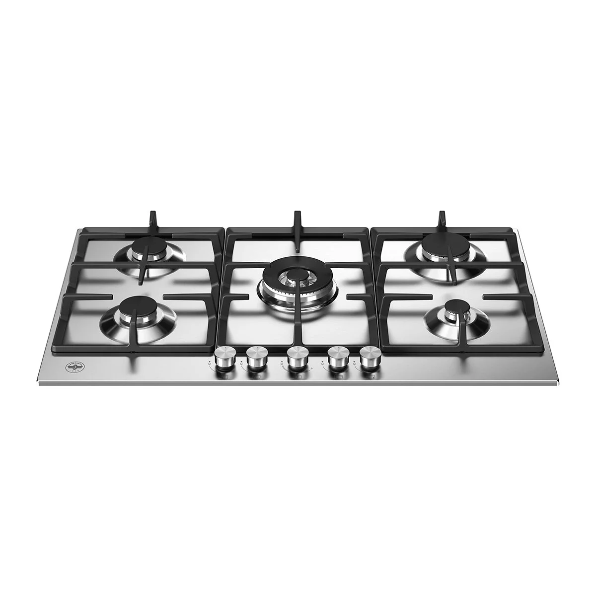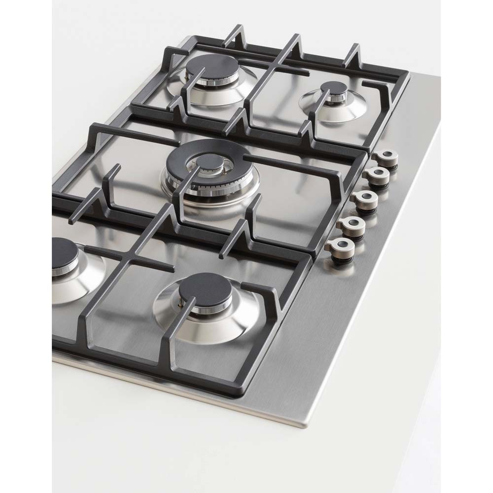 Εστία αερίου ανοξείδωτη με 5 καυστήρες με διασπορείς αλουμινίου, σχάρες χυτοσιδήρου, WOK καυστήρας διπλής φλόγας & διπλής ζώνης 5kW, επιλογείς με μεταλλικό φινίρισμα