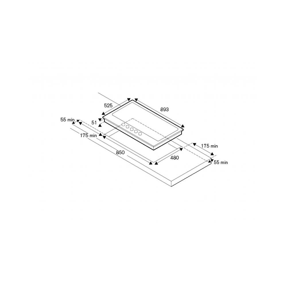 89εκ. – εστία αερίου με 5 καυστήρες, μαύρη κρυστάλλινη επιφάνεια, 5 καυστήρες με διασπορείς αλουμινίου και καπάκια ενσωματωμένα (mono-block), σχάρες χυτοσιδήρου, WOK καυστήρας διπλής φλόγας & διπλής ζώνης 5kW, επιλογείς με μεταλλικό φινίρισμα