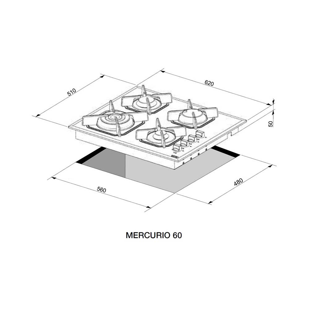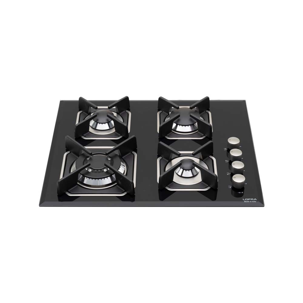 Εστία αερίου σε χρώμα μαύρο, 4 καυστήρες sabaf 3ης γενιάς, ο ένας διπλής φλόγας WOK 3,70kW, 4 ανεξάρτητες σχάρες από μαντέμι και ανοξείδωτες βάσεις.