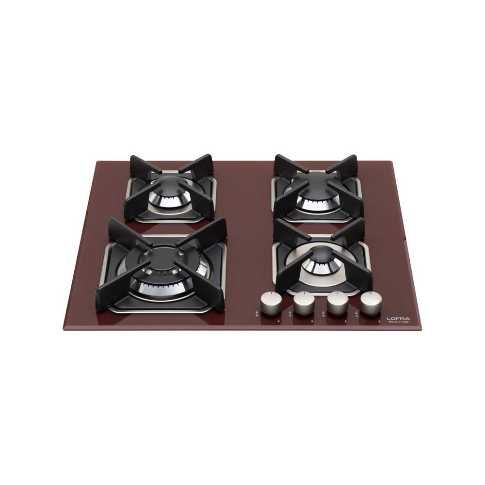 Εστία αερίου σε χρώμα κόκκινο κρασί, 4 καυστήρες sabaf 3ης γενιάς, ο ένας διπλής φλόγας WOK 3,70kW, 4 ανεξάρτητες σχάρες από μαντέμι και ανοξείδωτες βάσεις.