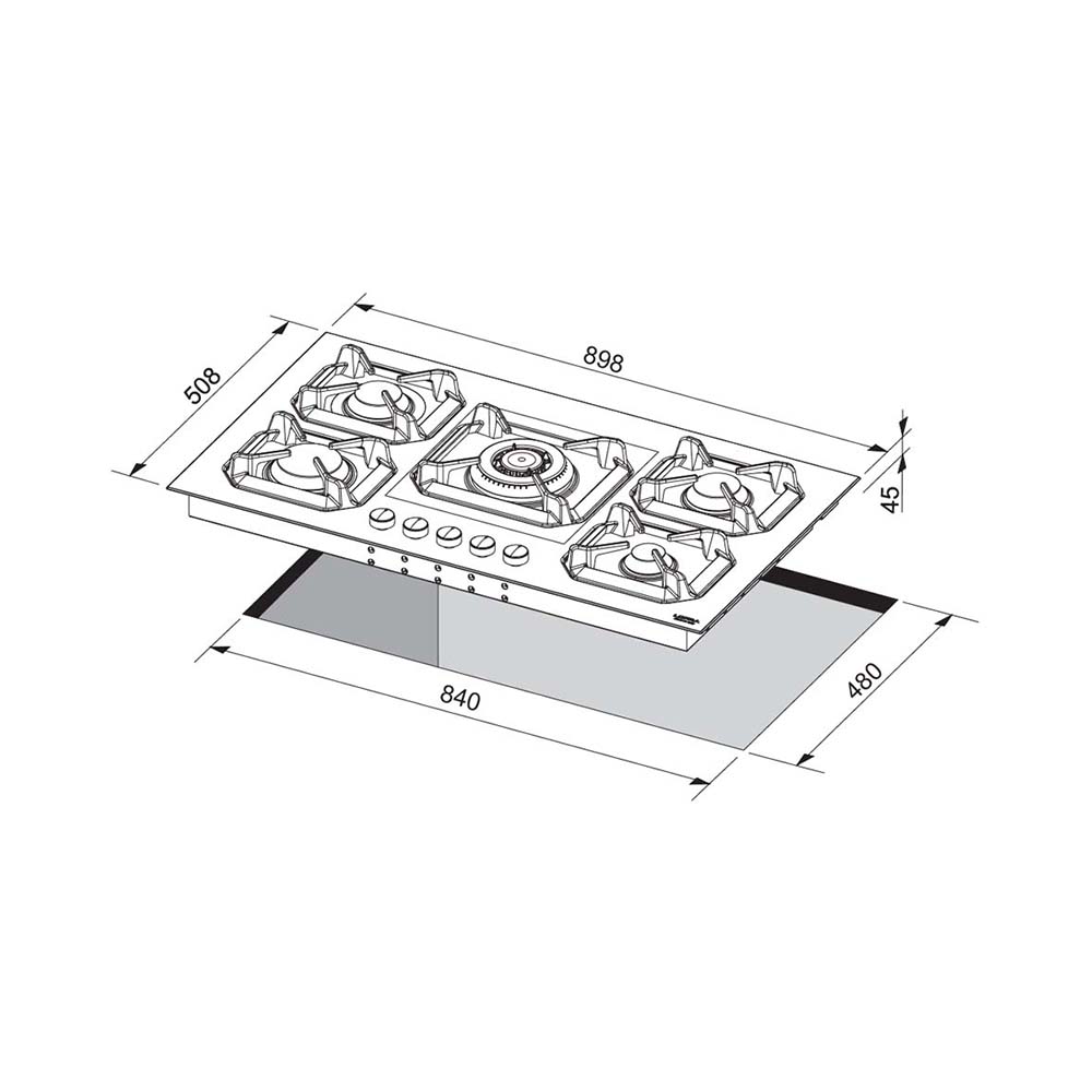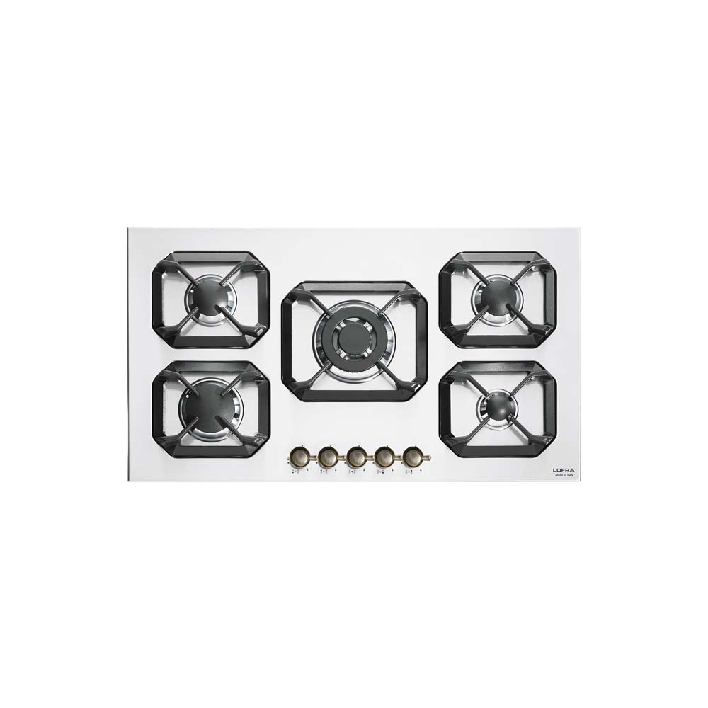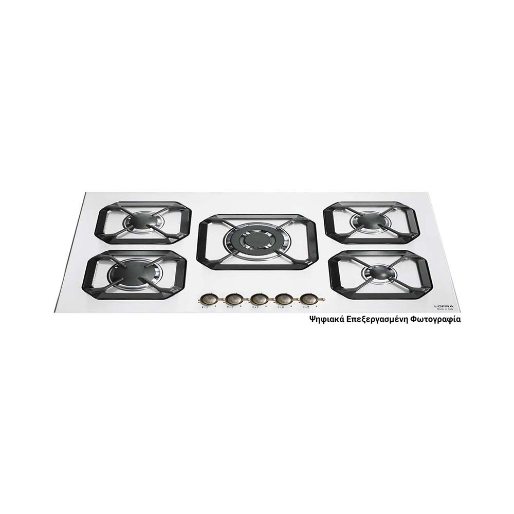 90εκ. – εστία αερίου με 5 καυστήρες, επισμαλτωμένη μεταλλική επιφάνεια σε χρώμα λευκό περλέ -BP, μεταλλικοί επιλογείς σε χρώμα μπρούτζινο, 5 ανεξάρτητες σχάρες από ενισχυμένο κράμα χυτοσιδήρου, 4 αποδοτικότεροι καυστήρες αερίου sabaf 3ης γενιάς και1 καυστήρας διπλής φλόγας WOK 3,70kW