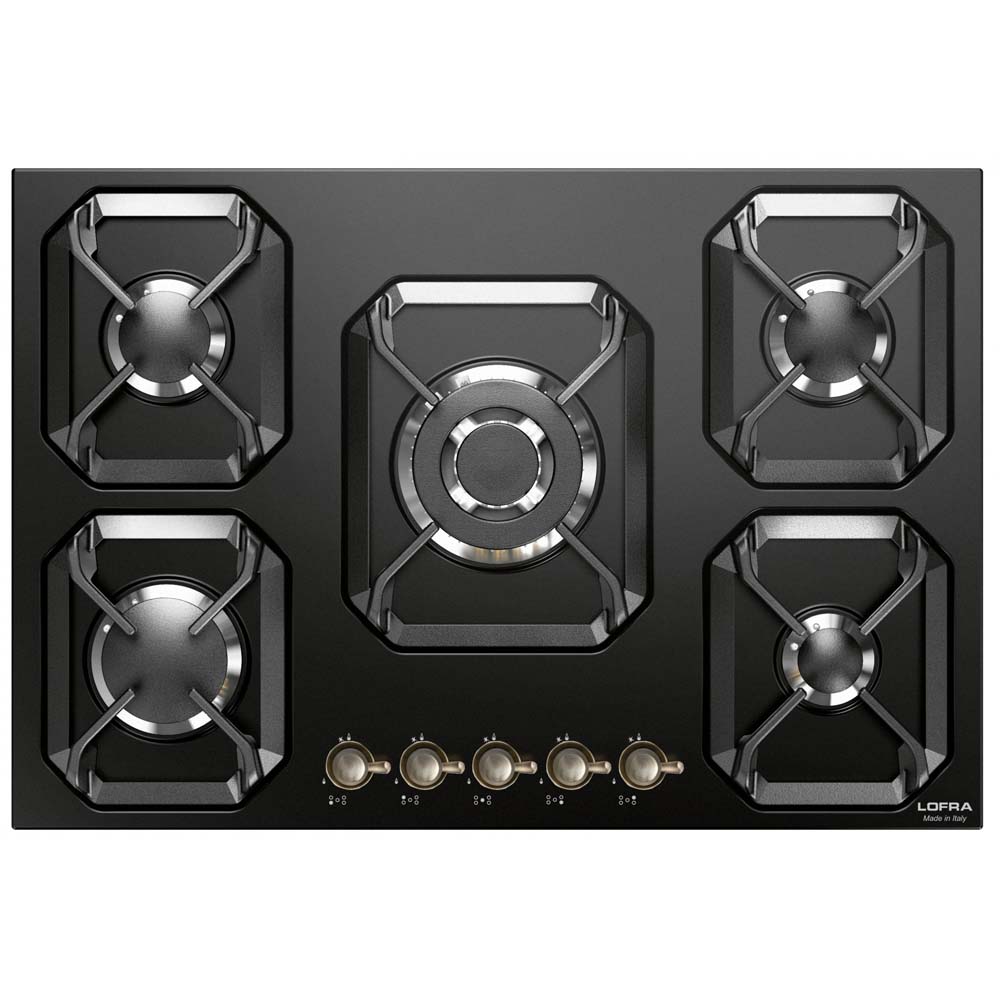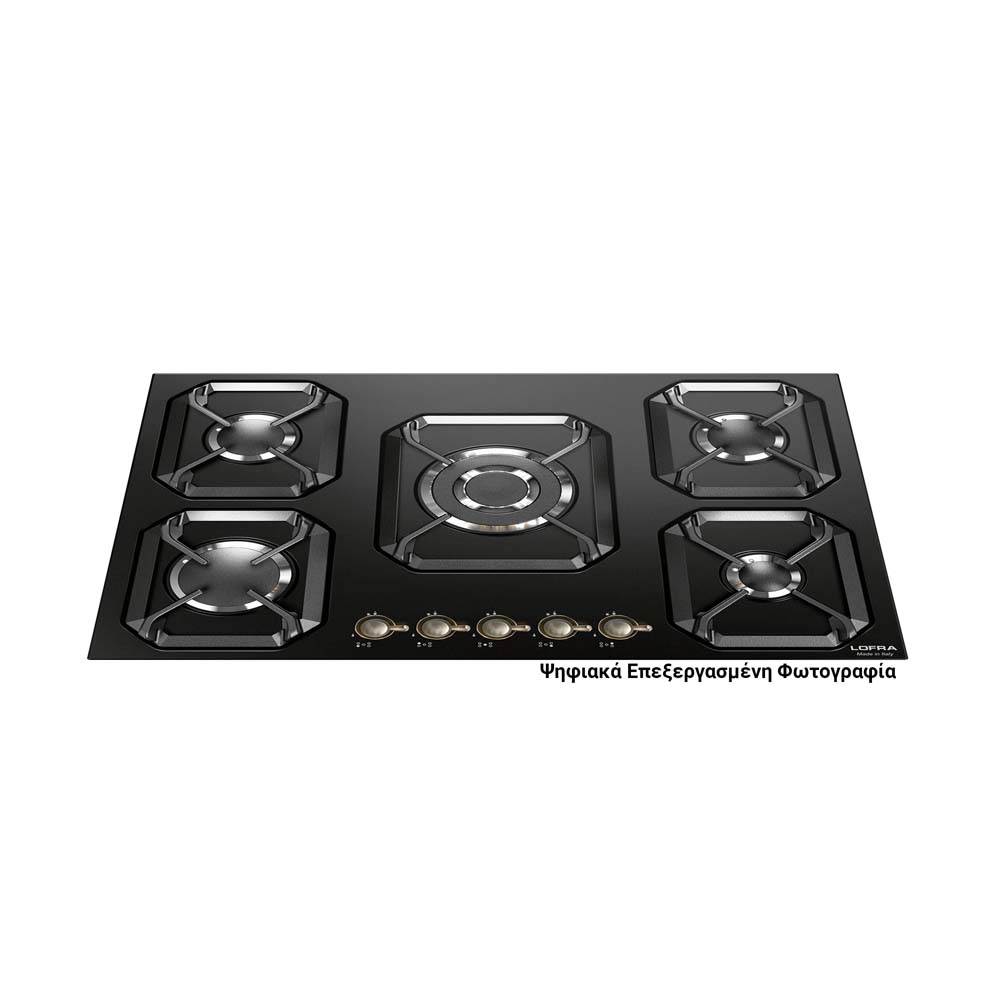 75εκ. – εστία αερίου με 5 καυστήρες, επισμαλτωμένη μεταλλική επιφάνεια σε χρώμα μαύρο ματ -NM, μεταλλικοί επιλογείς μπρούτζινοι, 5 ανεξάρτητες σχάρες από ενισχυμένο κράμα χυτοσιδήρου, 4 αποδοτικότεροι καυστήρες αερίου sabaf 3ης γενιάς και1 καυστήρας διπλής φλόγας WOK 3,70kW