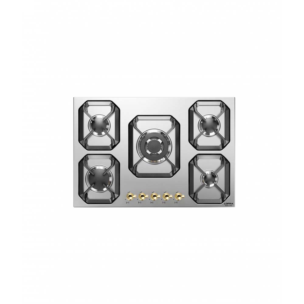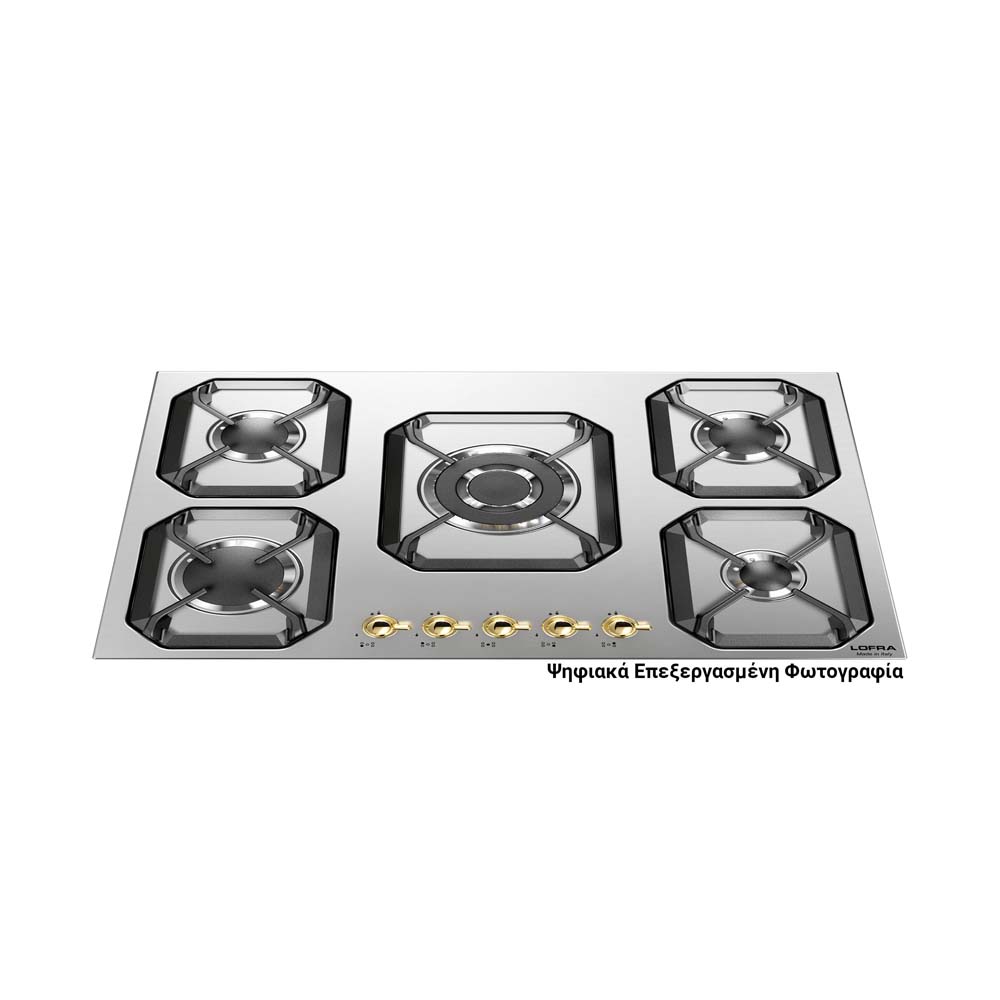 75εκ. – εστία αερίου με 5 καυστήρες, μεταλλική ανοξείδωτη επιφάνεια, μεταλλικοί επιλογείς σε χρώμα χρυσό, 5 ανεξάρτητες σχάρες από ενισχυμένο κράμα χυτοσιδήρου, 4 αποδοτικότεροι καυστήρες αερίου sabaf 3ης γενιάς και1 καυστήρας διπλής φλόγας WOK 3,70kW