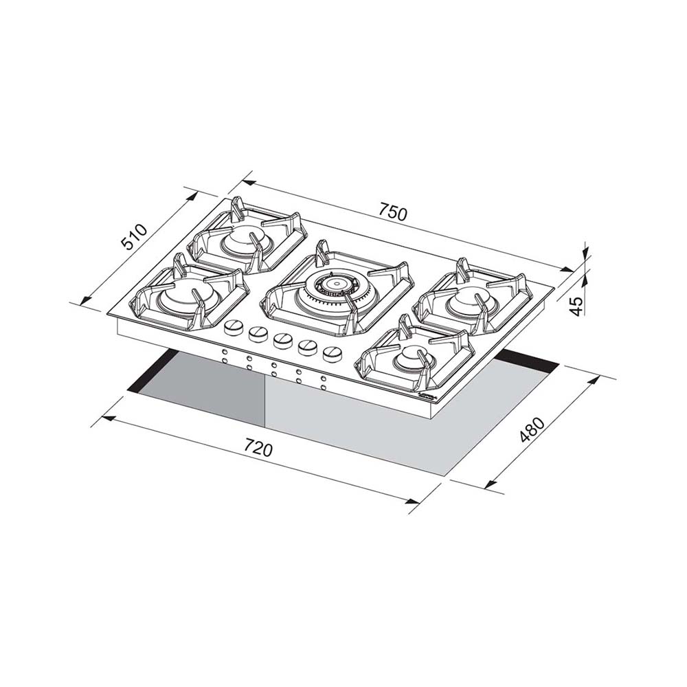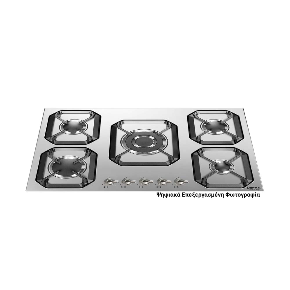 75εκ. – εστία αερίου με 5 καυστήρες, μεταλλική ανοξείδωτη επιφάνεια, μεταλλικοί επιλογείς σε χρώμα ασημένιο, 5 ανεξάρτητες σχάρες από ενισχυμένο κράμα χυτοσιδήρου, 4 αποδοτικότεροι καυστήρες αερίου sabaf 3ης γενιάς και1 καυστήρας διπλής φλόγας WOK 3,70kW