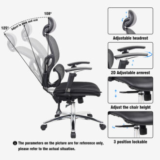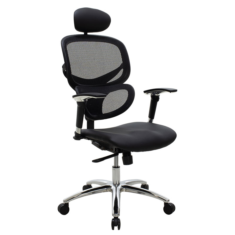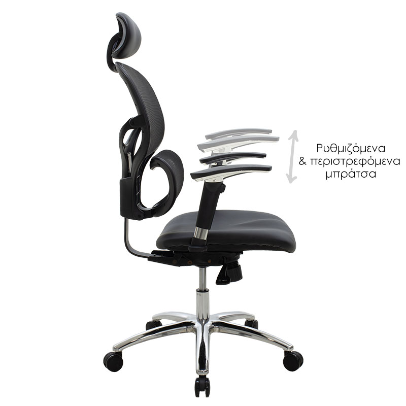 * Σχεδιασμός ψηλής πλάτης που ακολουθεί την σπονδυλική στήλη για μεγαλύτερη ανατομία σε διάτρητο ύφασμα Mesh σε μαύρο χρώμα. Η πλάτη μπορεί να ανεβοκατέβει σε διάφορες θέσεις ανεξάρτητα.
