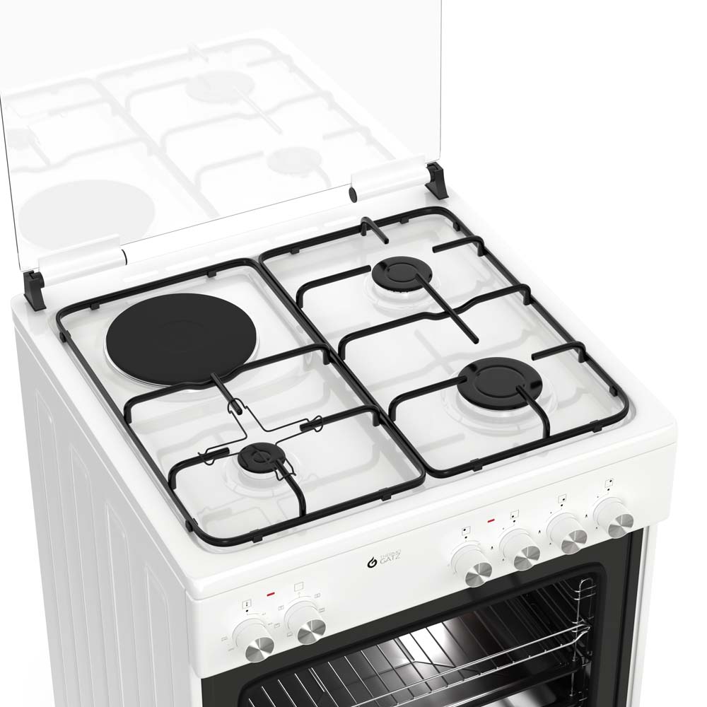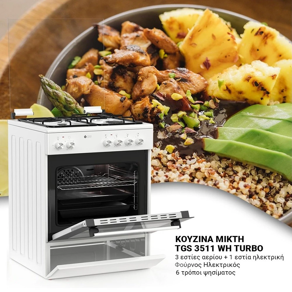 Κουζίνα μικτή TGS 3511 WH TURBO | φούρνος ηλεκτρικός με αέρα | γκριλ ηλεκτρικό | 3 εστίες αερίου | 1 ηλεκτρική. Απόλυτη Ευελιξία και Στυλ στην Καθημερινή Μαγειρική!