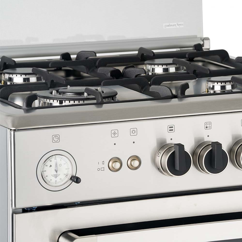 60×60εκ. – 4 εστίες αερίου – φούρνος αερίου με αέρα MultiGas, Grill Αερίου, 1 καυστήρας διπλής φλόγας WOK + 3 εστίες αερίου, σχάρες χυτοσιδήρου.