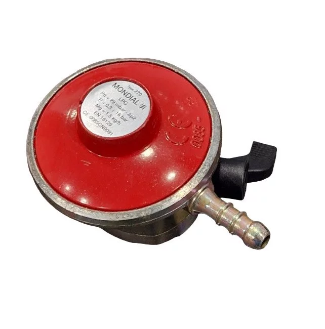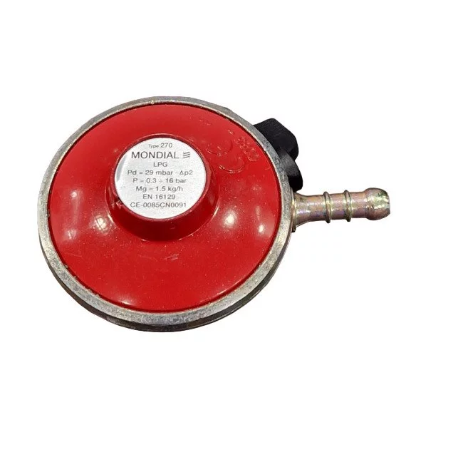 Κουμπωτός ρυθμιστής χαμηλής πίεσης 1,5kg Mondial Quick-on snap-on 29mbar, κατάλληλο για φιάλες υγραερίου που διαθέτουν σύστημα κουμπώματος, συμβατός με ελληνικές φιάλες υγραερίου και εμπορικές φιάλες