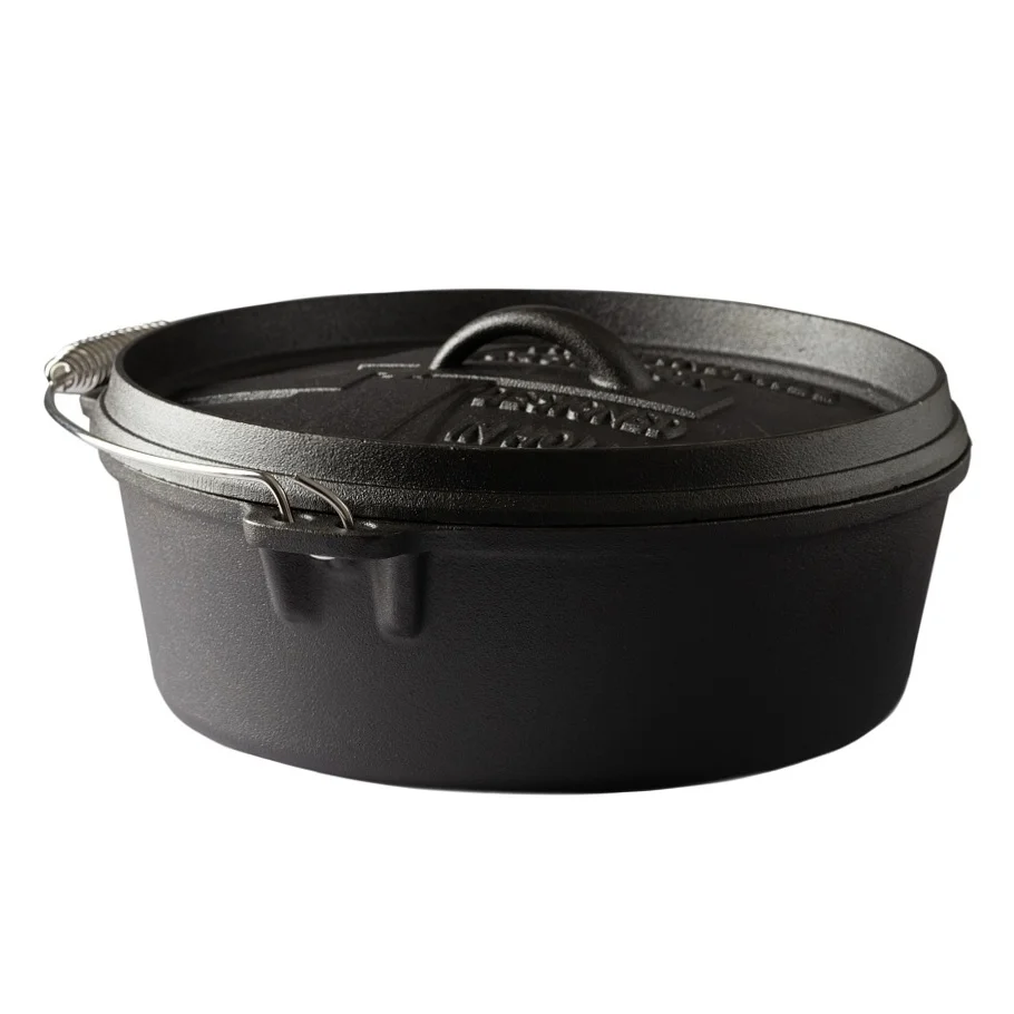 Το Dutch oven, διαθέτει χειρολαβή που διατηρείται πάντα δροσερή στο κράτημα, ενώ το εξολοκλήρου μαντεμένο καπάκι έχει περιμετρικά του γείσο για να μπορείς να τοποθετείς τα κάρβουνα ή τις μπρικέτες σου και να ψήνεις το φαγητό σου από όλες τις μεριές.