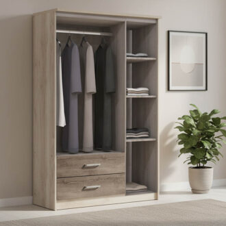 - Περιλαμβάνει δύο μεγάλες πόρτες με εσωτερική ράγα για κρεμάστρες και μία στενή πόρτα με 3 ράφια εσωτερικά. Στο κάτω μέρος φέρει δύο μεγάλα συρτάρια για την αποθήκευση ρούχων και αξεσουάρ.