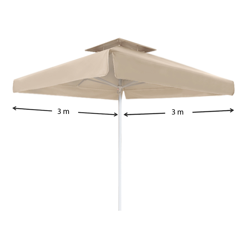 Τετράγωνη ομπρέλα αλουμινίου με τηλεσκοπικό μηχανισμό και διπλό αεραγωγό που επιτρέπει την κυκλοφορία του αέρα μειώνοντας ταυτόχρονα την πίεση του. Ιδανική επιλογή για επαγγελματική χρήση όπως beach bars, πισίνες και χώρους εστίασης.