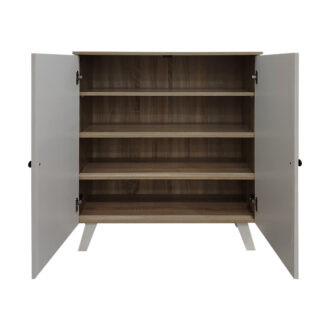 Η κομψή παπουτσοθήκη Cathi συνδυάζει μοντέρνο design με πρακτική λειτουργικότητα. Διαθέτει δύο πόρτες με χαρακτηριστικά οβάλ σχήματα και διακριτικά στρογγυλά χερούλια, προσδίδοντας μια παιχνιδιάρικη αλλά εκλεπτυσμένη αισθητική στον χώρο σας. Το εσωτερικό της προσφέρει αποθηκευτικό χώρο για την τακτοποίηση των υποδημάτων σας. Η χρωματική αντίθεση δημιουργεί ένα ευχάριστο οπτικό ενδιαφέρον. Στηρίζεται σε τέσσερα πόδια που ενισχύουν το μοντέρνο στυλ και προσφέρουν σταθερότητα.
