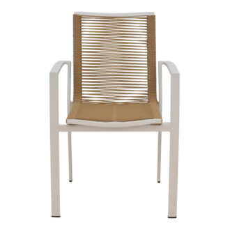 - Επένδυση καθίσματος με εξαιρετικής ποιότητας ύφασμα textilene σε φυσικό χρώμα. Το textilene είναι πλενόμενο και ανθεκτικό στις συνθήκες του εξωτερικού πέριβάλλοντος (ηλιακή ακτινοβολία, υγρασία).