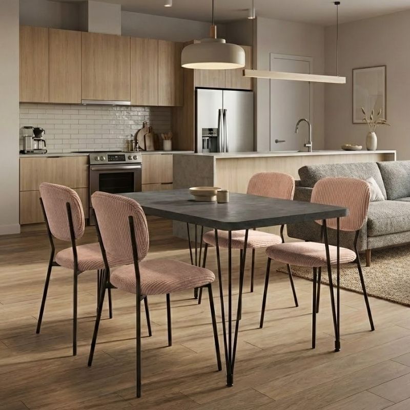 Η τραπεζαρία Roger – Kevin θα φέρει μία αίσθηση εκλεπτυσμένης κομψότητας στον χώρο σας. Το πλούσιο κοτλέ ύφασμα της καρέκλας χαρίζει ζεστασιά και υφή, ενώ τα μαύρα μεταλλικά πόδια προσδίδουν μοντέρνο χαρακτήρα και σταθερότητα. Ιδανική επιλογή τόσο για το σπίτι όσο και για επαγγελματικούς χώρους που θέλουν να επικοινωνήσουν ποιότητα και design σε κάθε λεπτομέρεια.