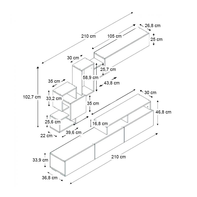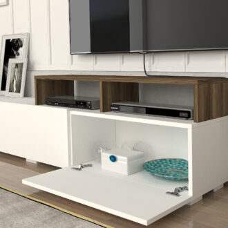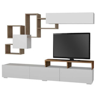 Σύνθεση τηλεόρασης Stamatia Megapap από μελαμίνη χρώμα λευκό – καρυδί 210×36,8×46,8εκ.