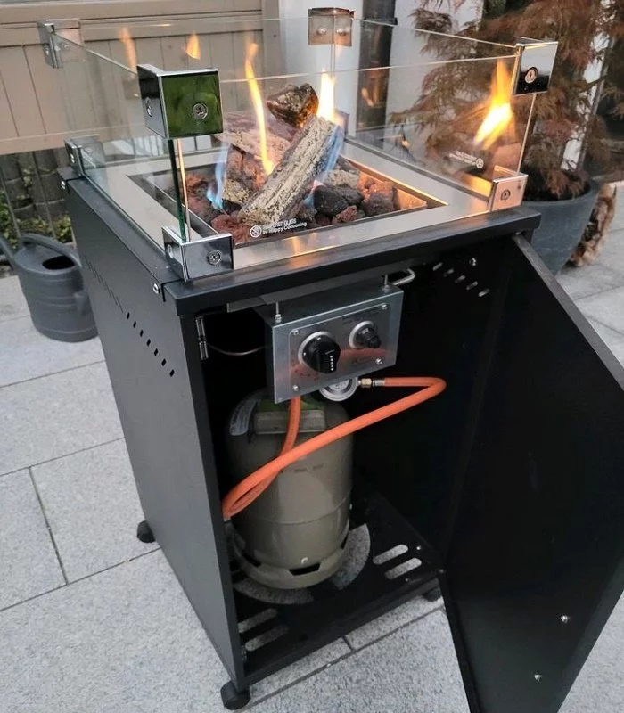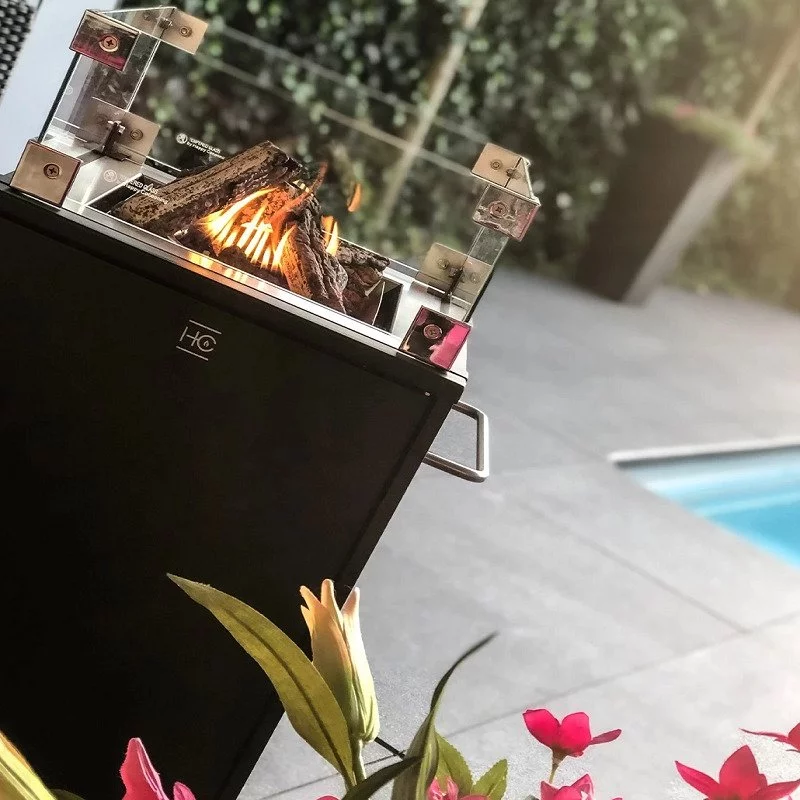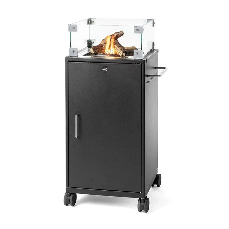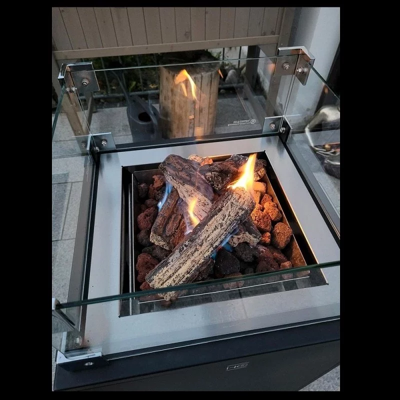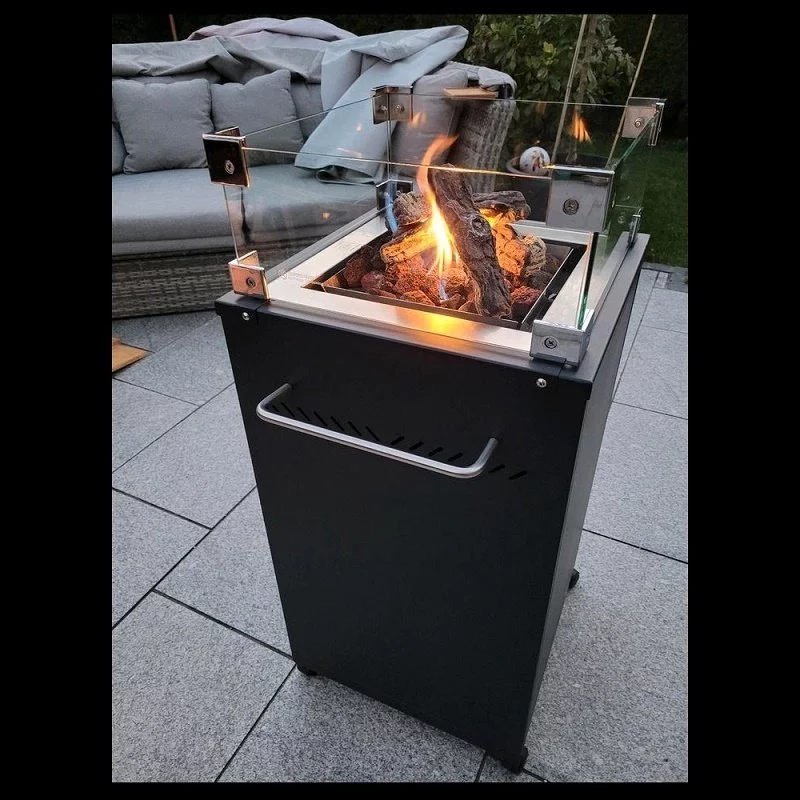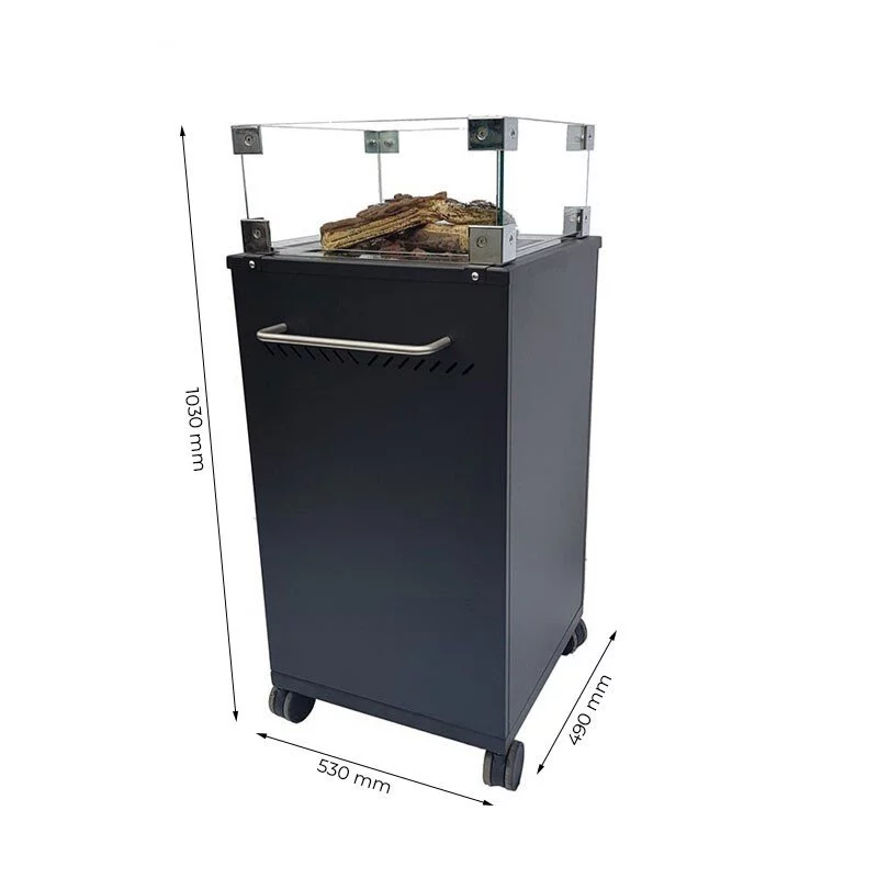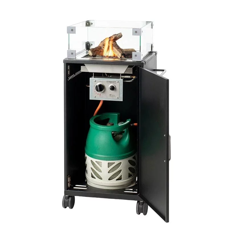 Εύχρηστο τροχήλατο τζάκι αερίου εξωτερικού χώρου, με φωτιά στο κέντρο, ηλεκτρονική ανάφλεξη και θερμοστοιχείο για εύκολο άναμμα, πιστοποιημένο και ασφαλές προϊον, κατάλληλο για εξωτερικούς χώρους, ευχάριστη και φιλική προς το χρήστη φωτιά χωρίς καπνό ή σπίθες.