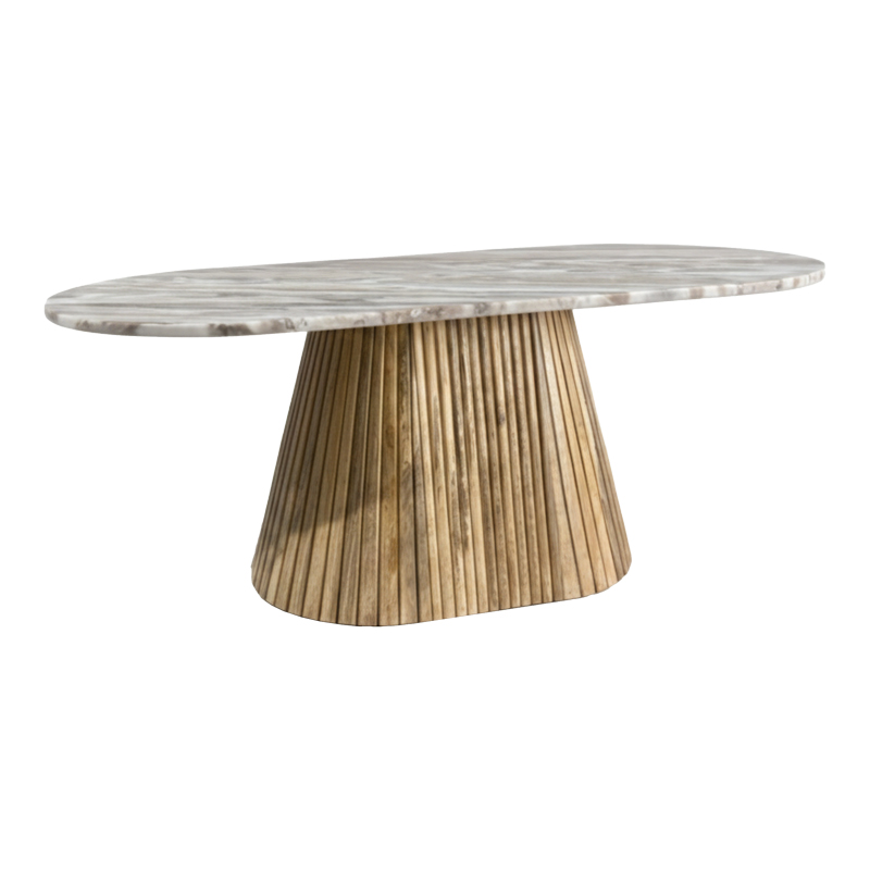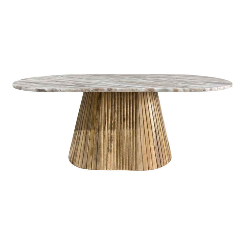 Η βάση του τραπεζιού είναι κατασκευασμένη από μασίφ Ξύλο Μάνγκο, με ενα ιδιαίτερο χαρακτηριστικό την ανάγλυφη, ραβδωτή υφή της, η οποία δημιουργεί ένα εντυπωσιακό οπτικό ενδιαφέρον και μια ζεστή, σύγχρονη αίσθηση.