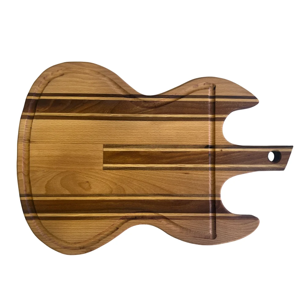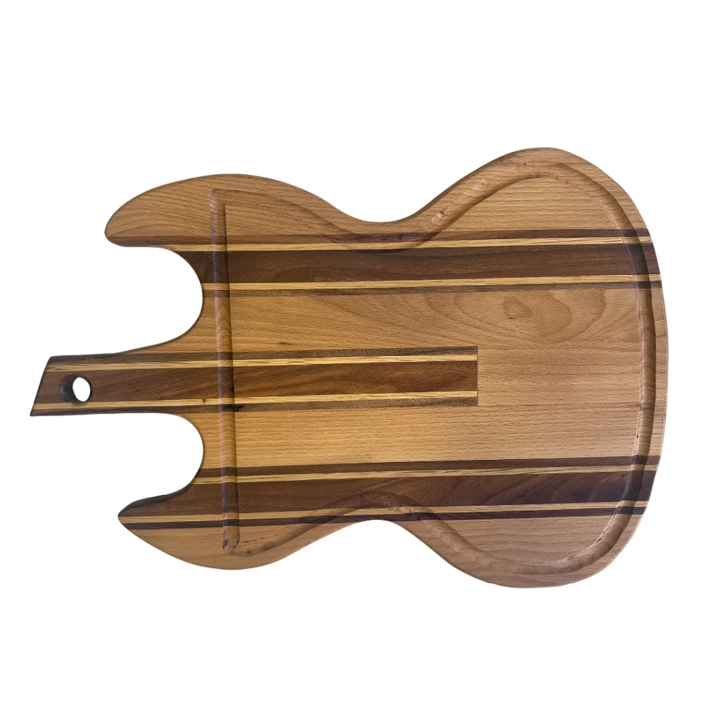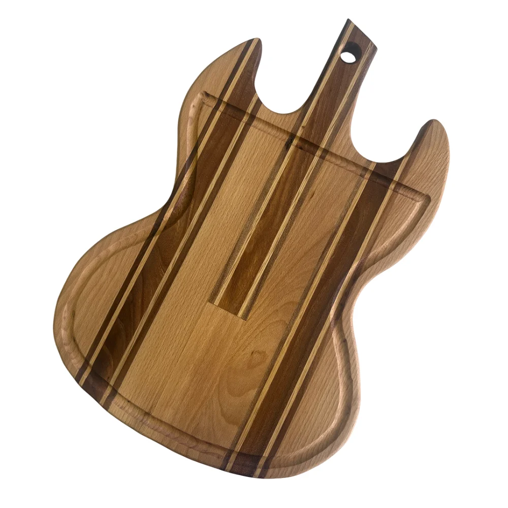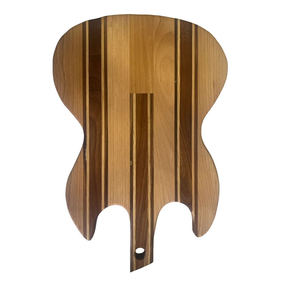 Χειροποίητο Ξύλο Κοπής σε Σχήμα Κιθάρας και δίσκος σερβιρίσματος από φτελιά, οξιά και δρυς, με φυσικό φινίρισμα και υψηλή αντοχή.