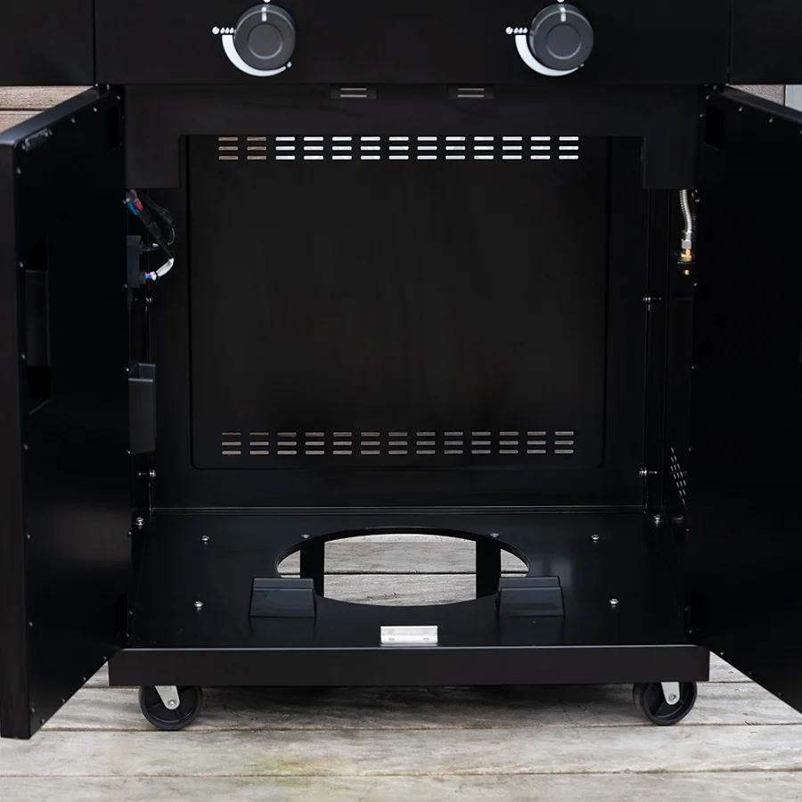 Ευρύχωρο ντουλάπι βάσης. Διαθέτει βάση για φιάλη υγραερίου έως 11 kg και στιβαρά ανοξείδωτα ροδάκια, εκ των οποίων τα δύο με φρένο ασφάλισης για σταθερότητα και εύκολη μετακίνηση.