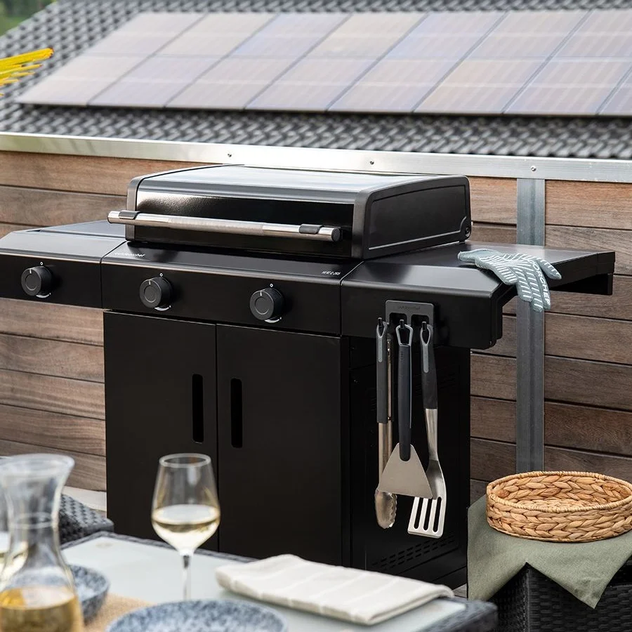 Το ευρύχωρο ντουλάπι βάσης φιλοξενεί με ασφάλεια φιάλη υγραερίου έως 11 kg, ενώ τα σταθερά πλαϊνά ράφια αντέχουν άνετα βαριά σκεύη και αξεσουάρ ψησίματος.