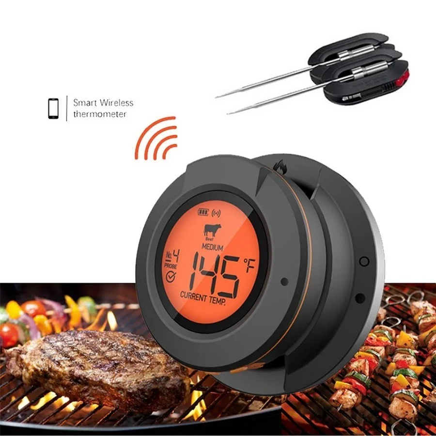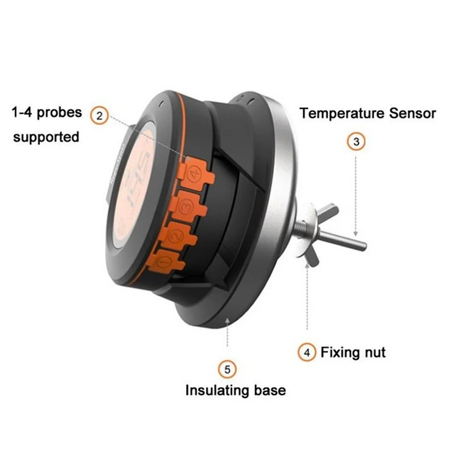 Ψηφιακό Θερμόμετρο Ψησταριάς AT-02 – 5 σε 1. 4 είδη θερμοκρασιών φαγητού και 1 θερμοκρασία περιβάλλοντος ψησταριάς μπορούν να παρακολουθούνται ταυτόχρονα συνδυάζοντας τέλεια το παραδοσιακό διμεταλλικό θερμόμετρο καθώς και το θερμόμετρο Bluetooth.