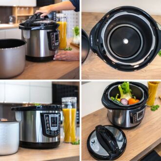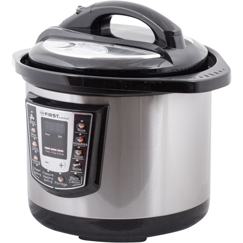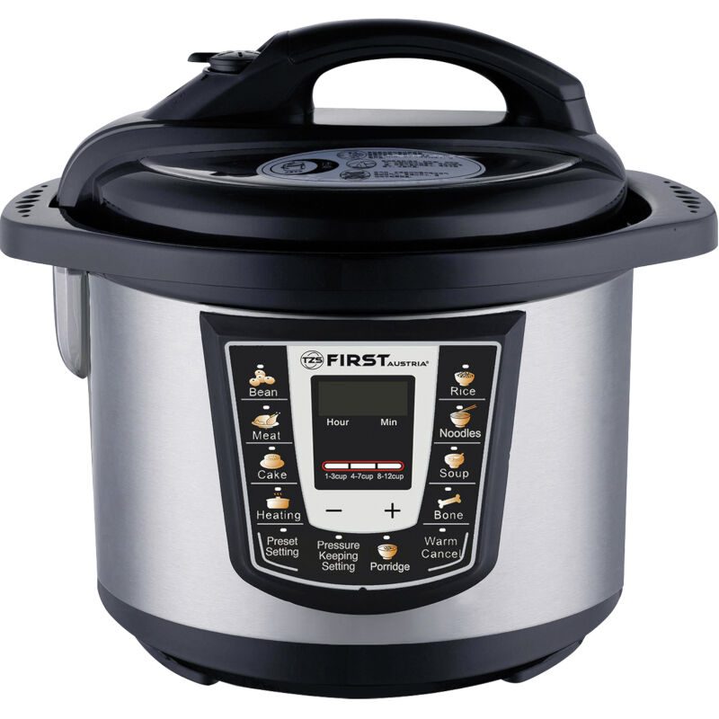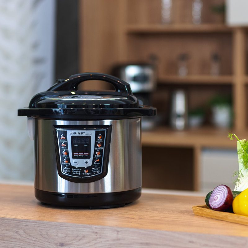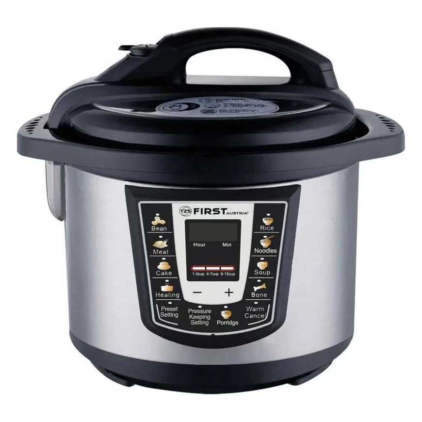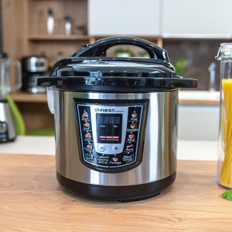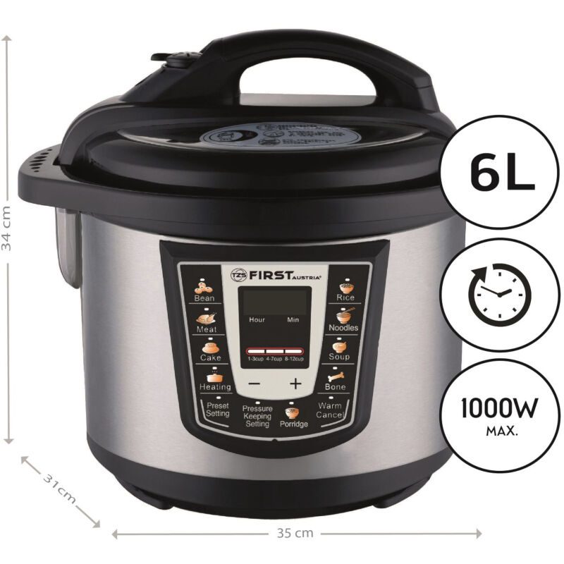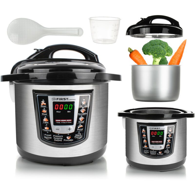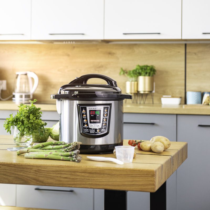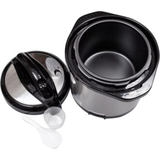 Χύτρα ταχύτητας και αργού μαγειρέματος 6 λίτρων και ισχύος 1000W. Το δοχείο μαγειρέματος διαθέτει αντικολλητική επίστρωση, είναι αφαιρούμενο για εύκολο πλύσιμο και έχει βαθμίδες μέτρησης για να είστε πάντα σίγουροι για την επιτυχία του φαγητού. Προγραμματίστε τη χύτρα ακόμα και 24 ώρες πριν, και θα σας ετοιμάσει το φαγητό που θέλετε την προκαθορισμένη ώρα. Μπορεί επίσης να διατηρήσει ζεστό το φαγητό σας μέχρι και 24 ώρες σε θερμοκρασία 60 – 80ο C. Διαθέτει 8 διαφορετικά προγράμματα για όσπρια, κρέας, κέικ, θέρμανση, ρύζι, ζυμαρικά, σούμα και παρασκευής ζωμού. Η ρύθμιση των προγραμμάτων γίνεται εύκολα με την οθόνη LED. Η θερμοκρασία ρυθμίζεται με ακρίβεια και ανεξάρτητα χάρη στον ενσωματωμένο θερμοστάτη. Το δοχείο και το καπάκι αφαιρούνται και αποσυναρμολογούνται εύκολα για να τα καθαρίζεται άψογα και εύκολα. Η χύτρα είναι πλήρως απαλλαγμένη από χημικά BPA.