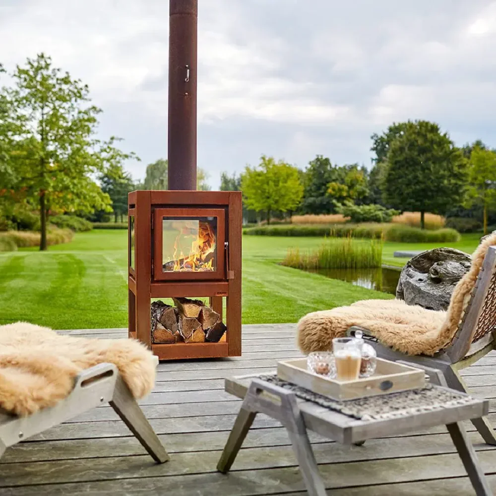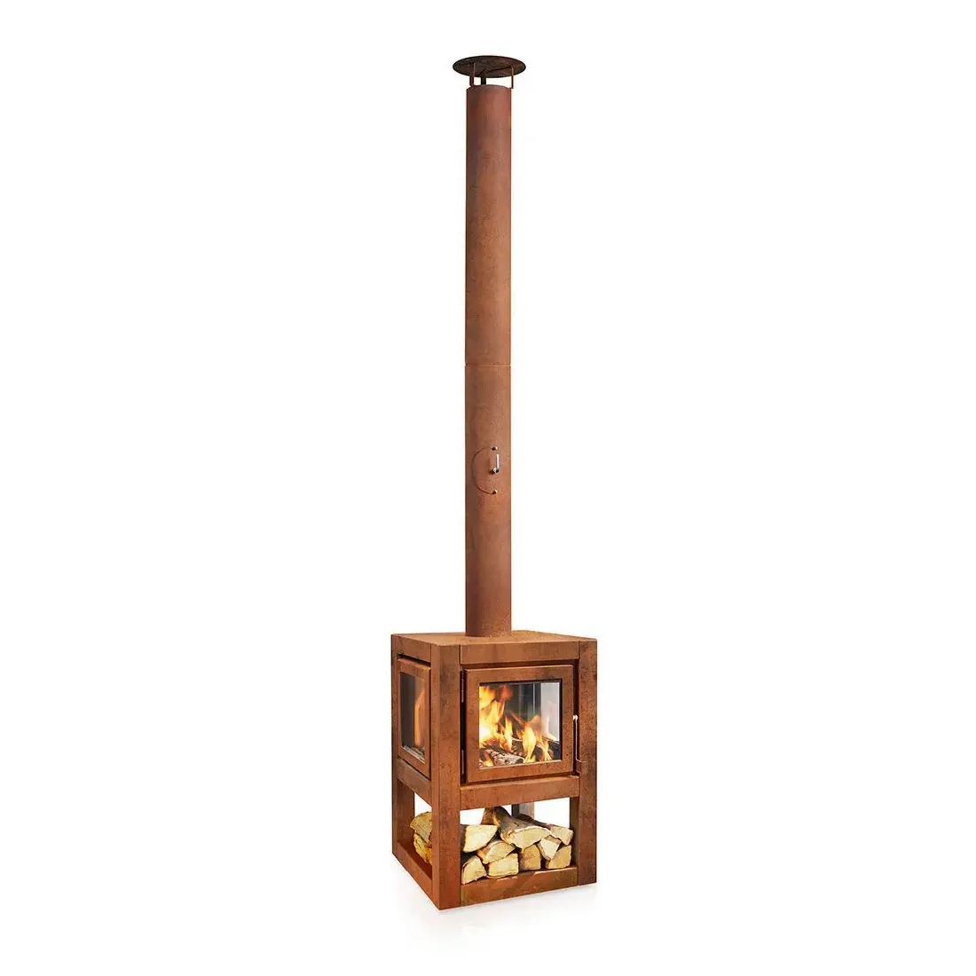 Ακόμη, ο σκελετός είναι από ατσάλι CorTen και δίνει στη σόμπα τη βιομηχανική εμφάνιση που βγαίνει από μόνη της σε κάθε βεράντα.