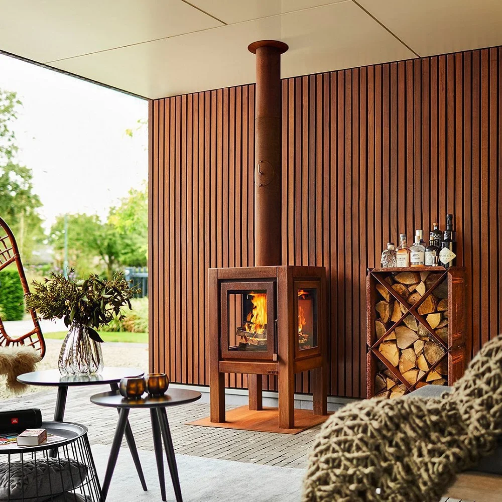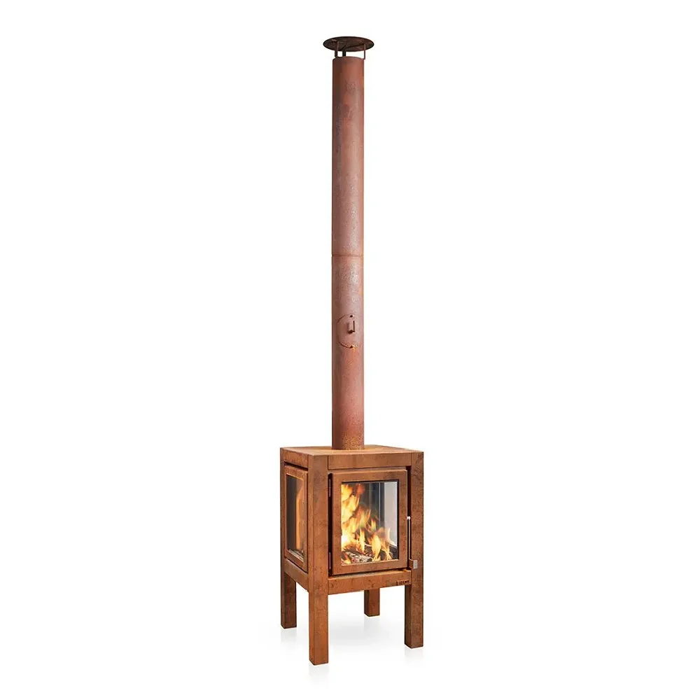 Ακόμη, ο σκελετός είναι από ατσάλι CorTen και δίνει στη σόμπα τη βιομηχανική εμφάνιση που βγαίνει από μόνη της σε κάθε βεράντα.